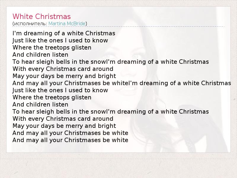 I'm dreaming of a white Christmas Just like the ones I used to know Where the treetops glisten And children listen To hear sleigh bells in the snowI'm dreaming of a white Christmas With every Christmas card around May your days be merry and bright And may all your Christmases be whiteI'm dreaming of a white Christmas Just like the ones I used to know Where the treetops glisten And children listen To hear sleigh bells in the snowI'm dreaming of a white Christmas With every Christmas card around May your days be merry and bright And may all your Christmases be white And may all your Christmases be white