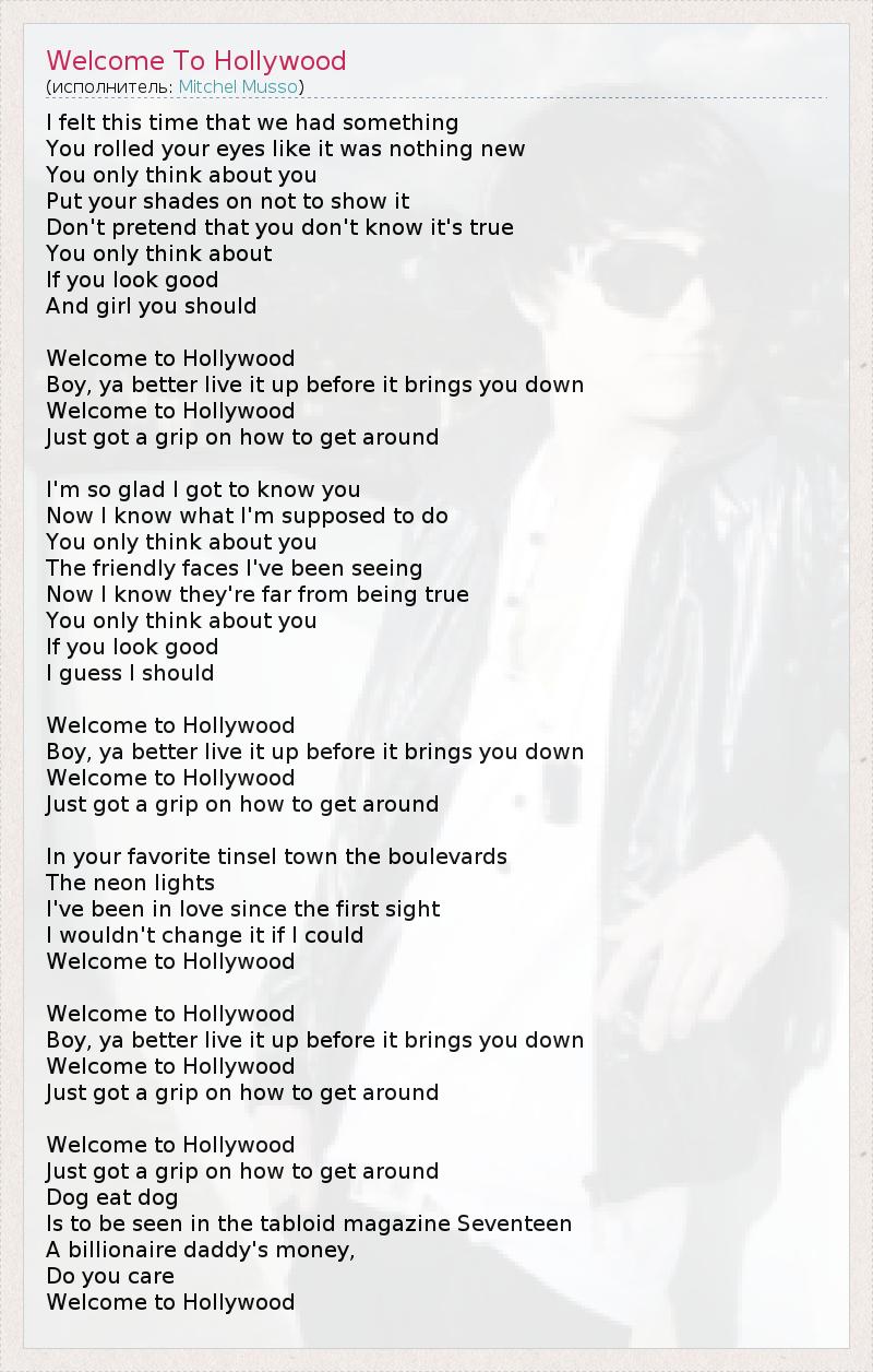 I felt this time that we had something You rolled your eyes like it was nothing new You only think about you Put your shades on not to show it Don't pretend that you don't know it's true You only think about If you look good And girl you should Welcome to Hollywood Boy, ya better live it up before it brings you down Welcome to Hollywood Just got a grip on how to get around I'm so glad I got to know you Now I know what I'm supposed to do You only think about you The friendly faces I've been seeing Now I know they're far from being true You only think about you If you look good I guess I should Welcome to Hollywood Boy, ya better live it up before it brings you down Welcome to Hollywood Just got a grip on how to get around In your favorite tinsel town the boulevards The neon lights I've been in love since the first sight I wouldn't change it if I could Welcome to Hollywood Welcome to Hollywood Boy, ya better live it up before it brings you down Welcome to Hollywood Just got a grip on how to get around Welcome to Hollywood Just got a grip on how to get around Dog eat dog Is to be seen in the tabloid magazine Seventeen A billionaire daddy's money, Do you care Welcome to Hollywood