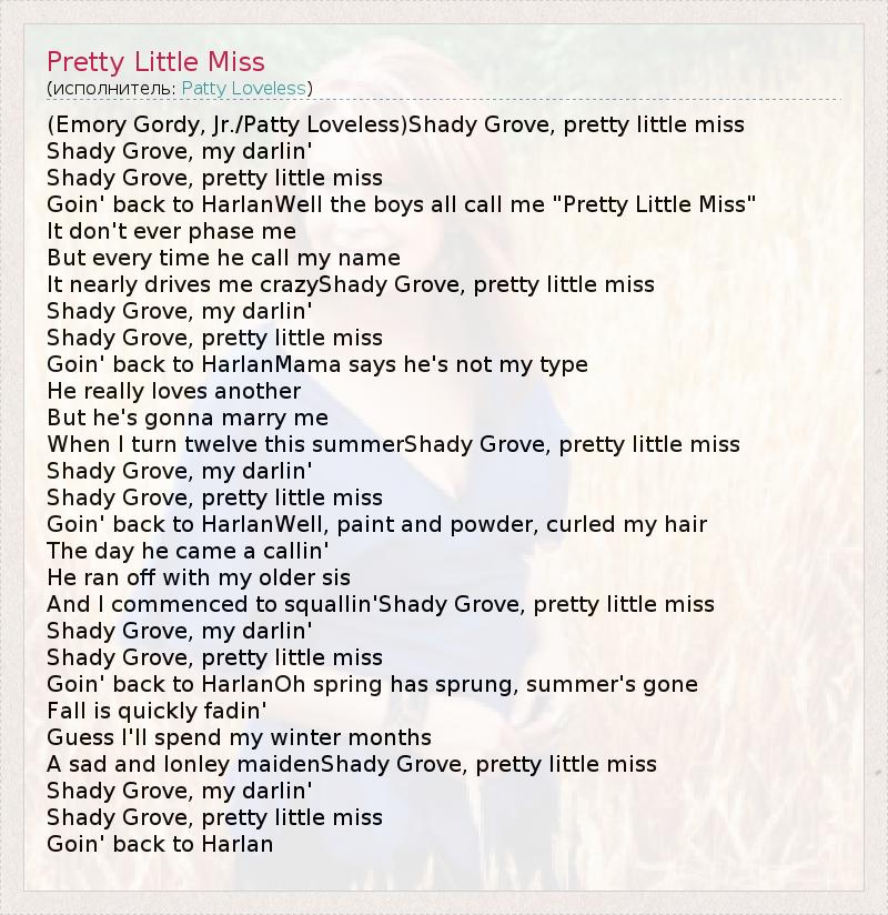 (Emory Gordy, Jr./Patty Loveless)Shady Grove, pretty little miss Shady Grove, my darlin' Shady Grove, pretty little miss Goin' back to HarlanWell the boys all call me "Pretty Little Miss" It don't ever phase me But every time he call my name It nearly drives me crazyShady Grove, pretty little miss Shady Grove, my darlin' Shady Grove, pretty little miss Goin' back to HarlanMama says he's not my type He really loves another But he's gonna marry me When I turn twelve this summerShady Grove, pretty little miss Shady Grove, my darlin' Shady Grove, pretty little miss Goin' back to HarlanWell, paint and powder, curled my hair The day he came a callin' He ran off with my older sis And I commenced to squallin'Shady Grove, pretty little miss Shady Grove, my darlin' Shady Grove, pretty little miss Goin' back to HarlanOh spring has sprung, summer's gone Fall is quickly fadin' Guess I'll spend my winter months A sad and lonley maidenShady Grove, pretty little miss Shady Grove, my darlin' Shady Grove, pretty little miss Goin' back to Harlan