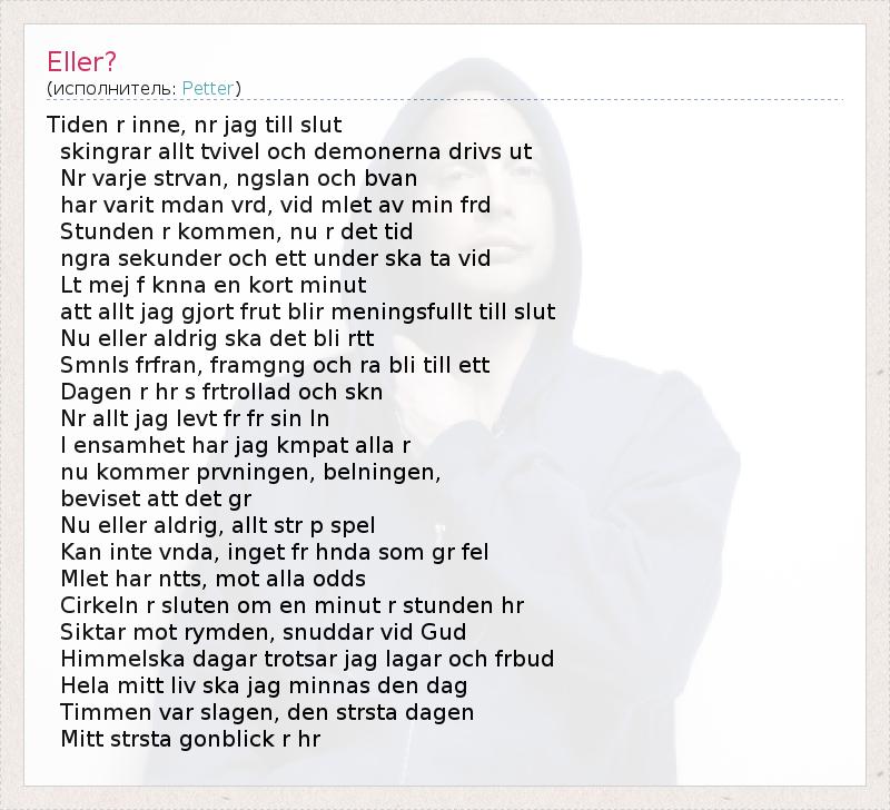Это интересно:Шведский хип-хоп исполнитель (полное имя Petter Alexis Askergren) родился 25 мая 1974 в Södermalm (район Стокгольма). В 90-е работал с хип-хоп группой Sherlock, после этого занялся сольной карьерой. Синглы Mikrofonkåt и Vinden Har Vänt принесли музыканту известность. Песни Petter повествуют о его личной жизни, карьере и детстве.