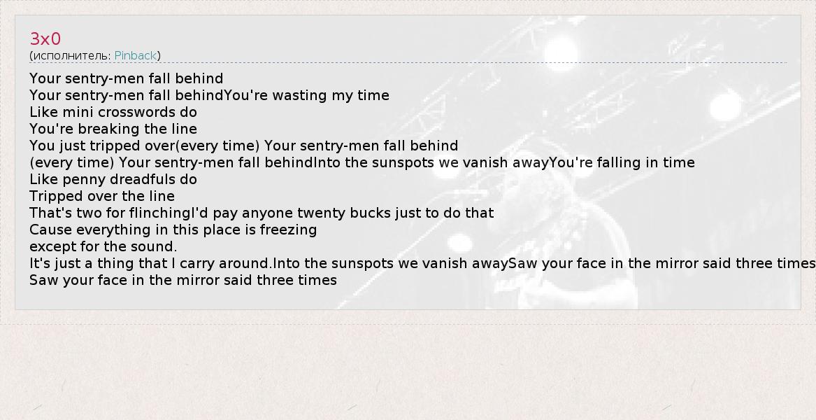 Это интересно:Pinback - indie rock группа из San Diego, CA, в данный момент подписаная на лейбле Touch and Go Records. Группа была создана в 1998 двумя певцами и мульти-инструменталистами: Армистэдом Бурвеллом Смитом Четвертым (или просто - Зак Смит) и Робом Кроу.За 10 лет существования группа записала четыре полноформатных альбома, последний из которых, The Autumn Of Seraphs, вышел... продолжение