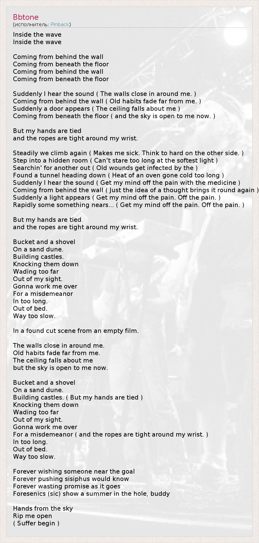 Это интересно:Pinback - indie rock группа из San Diego, CA, в данный момент подписаная на лейбле Touch and Go Records. Группа была создана в 1998 двумя певцами и мульти-инструменталистами: Армистэдом Бурвеллом Смитом Четвертым (или просто - Зак Смит) и Робом Кроу.За 10 лет существования группа записала четыре полноформатных альбома, последний из которых, The Autumn Of Seraphs, вышел... продолжение