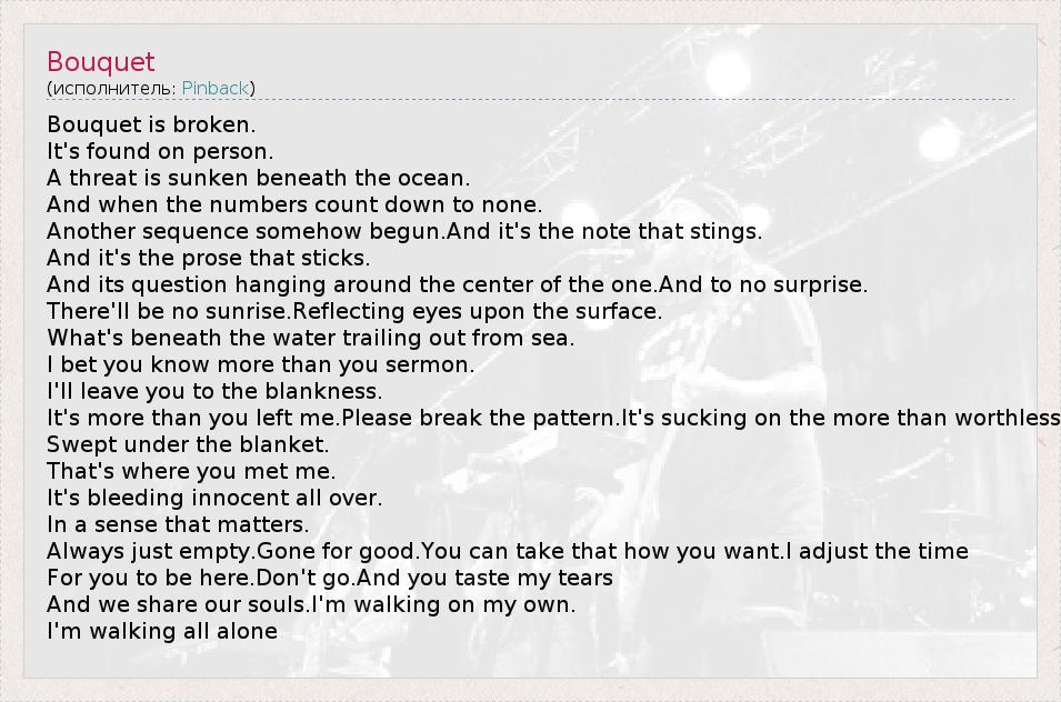 Это интересно:Pinback - indie rock группа из San Diego, CA, в данный момент подписаная на лейбле Touch and Go Records. Группа была создана в 1998 двумя певцами и мульти-инструменталистами: Армистэдом Бурвеллом Смитом Четвертым (или просто - Зак Смит) и Робом Кроу.За 10 лет существования группа записала четыре полноформатных альбома, последний из которых, The Autumn Of Seraphs, вышел... продолжение