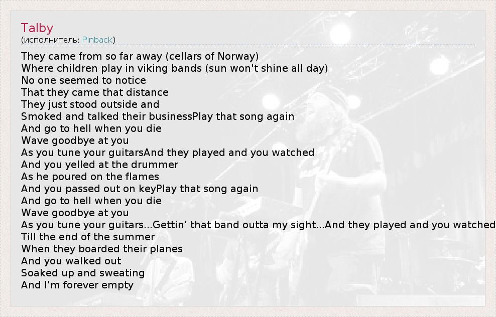 Это интересно:Pinback - indie rock группа из San Diego, CA, в данный момент подписаная на лейбле Touch and Go Records. Группа была создана в 1998 двумя певцами и мульти-инструменталистами: Армистэдом Бурвеллом Смитом Четвертым (или просто - Зак Смит) и Робом Кроу.За 10 лет существования группа записала четыре полноформатных альбома, последний из которых, The Autumn Of Seraphs, вышел... продолжение