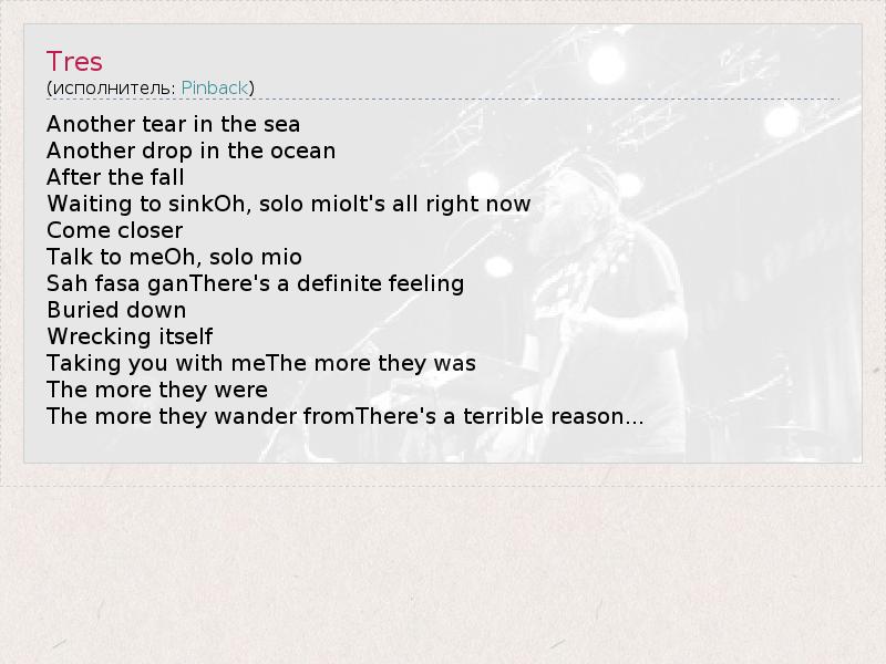Это интересно:Pinback - indie rock группа из San Diego, CA, в данный момент подписаная на лейбле Touch and Go Records. Группа была создана в 1998 двумя певцами и мульти-инструменталистами: Армистэдом Бурвеллом Смитом Четвертым (или просто - Зак Смит) и Робом Кроу.За 10 лет существования группа записала четыре полноформатных альбома, последний из которых, The Autumn Of Seraphs, вышел... продолжение