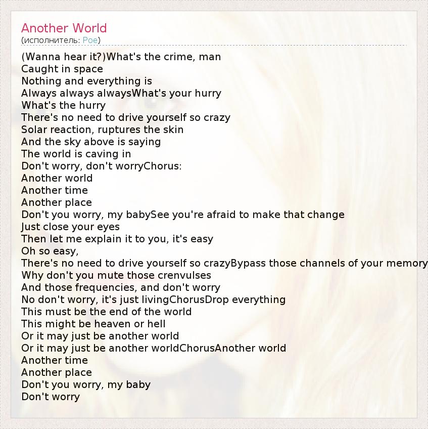 (Wanna hear it?)What's the crime, man Caught in space Nothing and everything is Always always alwaysWhat's your hurry What's the hurry There's no need to drive yourself so crazy Solar reaction, ruptures the skin And the sky above is saying The world is caving in Don't worry, don't worryChorus: Another world Another time Another place Don't you worry, my babySee you're afraid to make that change Just close your eyes Then let me explain it to you, it's easy Oh so easy, There's no need to drive yourself so crazyBypass those channels of your memory Why don't you mute those crenvulses And those frequencies, and don't worry No don't worry, it's just livingChorusDrop everything This must be the end of the world This might be heaven or hell Or it may just be another world Or it may just be another worldChorusAnother world Another time Another place Don't you worry, my baby Don't worry