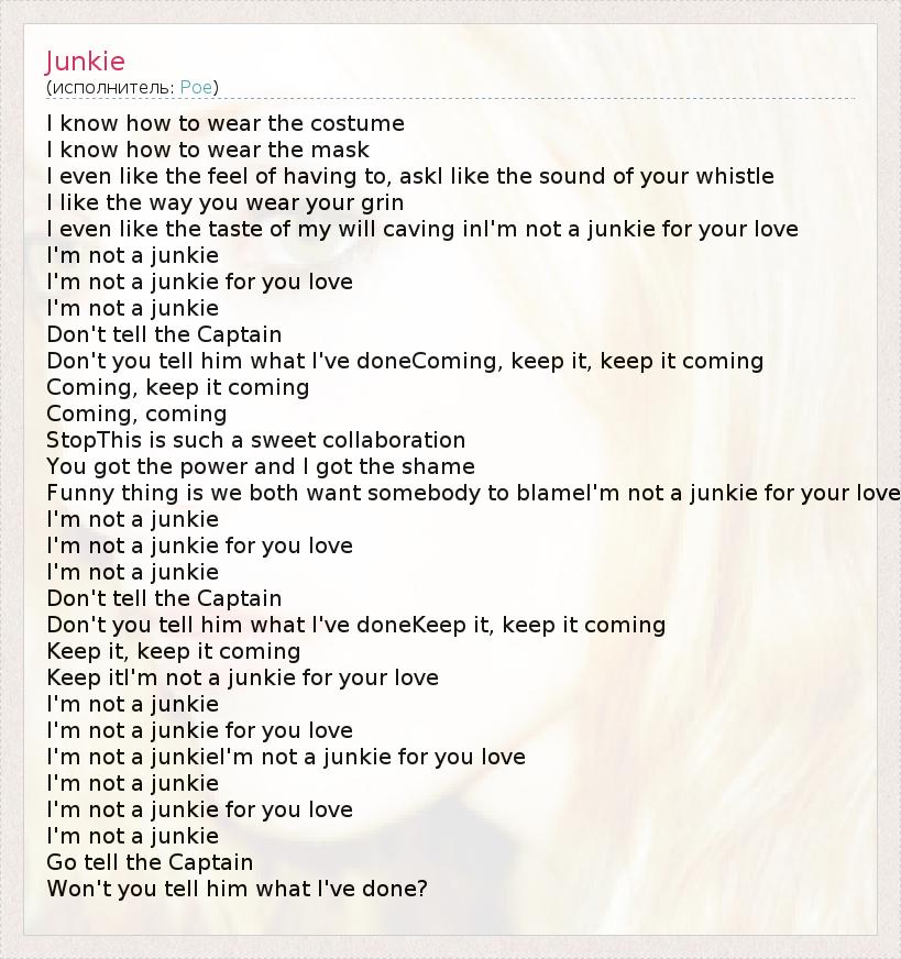 I know how to wear the costume I know how to wear the mask I even like the feel of having to, askI like the sound of your whistle I like the way you wear your grin I even like the taste of my will caving inI'm not a junkie for your love I'm not a junkie I'm not a junkie for you love I'm not a junkie Don't tell the Captain Don't you tell him what I've doneComing, keep it, keep it coming Coming, keep it coming Coming, coming StopThis is such a sweet collaboration You got the power and I got the shame Funny thing is we both want somebody to blameI'm not a junkie for your love I'm not a junkie I'm not a junkie for you love I'm not a junkie Don't tell the Captain Don't you tell him what I've doneKeep it, keep it coming Keep it, keep it coming Keep itI'm not a junkie for your love I'm not a junkie I'm not a junkie for you love I'm not a junkieI'm not a junkie for you love I'm not a junkie I'm not a junkie for you love I'm not a junkie Go tell the Captain Won't you tell him what I've done?