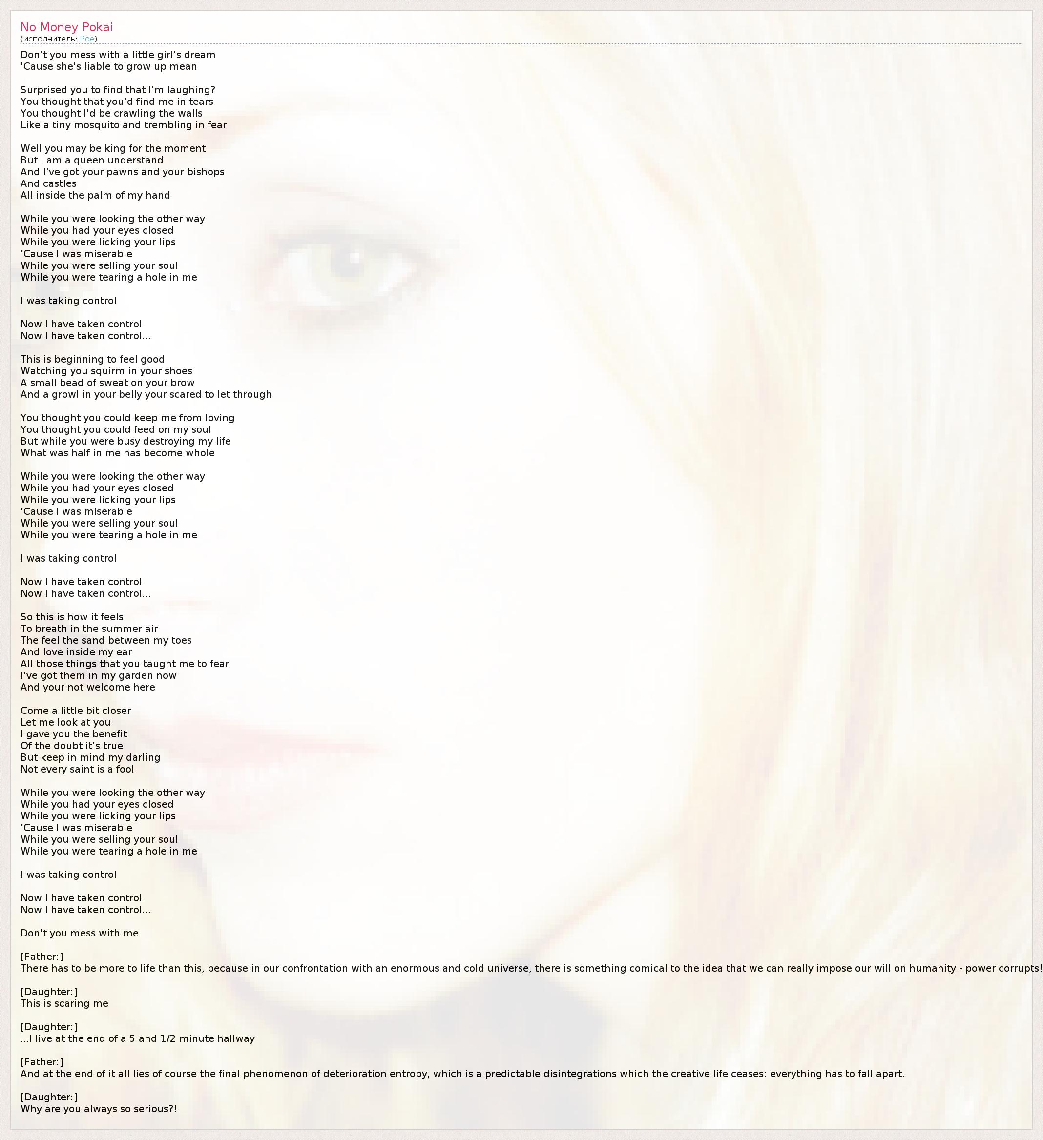 Не шути с мечтами маленькой девочки, Потому что обязательно вырастет убогой. Удивлен, что теперь я смеюсь? Ведь ты думал, что обнаружишь меня плачущей. Ты думал, я буду ползать по стенам, Как крошка-комар и в страхе трепетать. Ну, может на мгновенье ты и король положения, Но королева я, пойми. И все твои пешки, слоны И ладьи — Всё у меня в руках. Пока ты смотрел в другую сторону, Пока твои глаза были закрыты, Пока ты облизывался, Потому что я была жалкой, Пока ты продавал свою душу, Пока ты рвал меня, Я захватывала контроль. Теперь же всё в моих руках, Теперь же всё в моих руках... Мне становится хорошо, Когда я вижу, как ты стоишь в смущении С капелькой пота на лбу И рыком, застрявшим у тебя в горле от страха. Ты думал, что сможешь удержать меня от любви, Думал, что сможешь поглотить мою душу. Но пока ты был слишком занят уничтожением моей жизни, То, что было лишь моей половиной, охватило меня всю. Пока ты смотрел в другую сторону, Пока твои глаза были закрыты, Пока ты облизывался, Потому что я была жалкой, Пока ты продавал свою душу, Пока ты рвал меня, Я захватывала контроль. Теперь же всё в моих руках, Теперь же всё в моих руках... Так вот, каково это, Вдыхать летний воздух, Чувствовать песчинки между пальцев ног, И слышать любовь. Все те вещи, что ты научил меня бояться, Теперь у меня в саду, И тебе там не рады. Подойди-ка поближе. Дай мне на тебя взглянуть. Поверь мне На слово, это правда, Но знаю, мой дорогой, Не каждый святой — дурак. Пока ты смотрел в другую сторону, Пока твои глаза были закрыты, Пока ты облизывался, Потому что я была жалкой, Пока ты продавал свою душу, Пока ты рвал меня, Я захватывала контроль. Теперь же всё в моих руках, Теперь же всё в моих руках... Не шути со мной! [Отец:] Должно быть что-то еще, ради чего жить, потому что в нашем противостоянии с огромнейшей и холодной вселенной есть некая ирония, ведь мы можем влиять на человечество одним своим желанием — дрянная сила! 1 [Дочь:] Это меня пугает. [Дочь:] ...Я живу в конце 5-ти с половиной минутного коридора. 2 [Отец:] И в итоге, конечно же, главным феноменом энтропии деградации (что означает предсказуемое разрушение), которую останавливает творческая жизнь, является то, что всё обязательно погибнет. [Дочь:] Почему ты вечно такой серьезный?! 1 — данные реплики на самом деле записаны настоящим отцом певицы, который умер в 1993 году. 2 — отсылка к одноименной песне певицы.