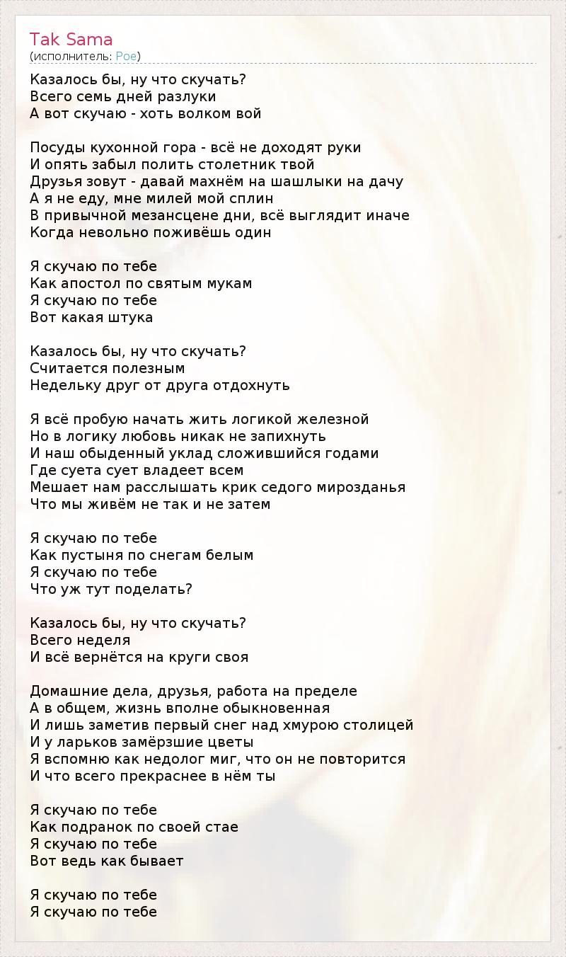 Казалось бы, ну что скучать? Всего семь дней разлуки А вот скучаю - хоть волком вой Посуды кухонной гора - всё не доходят руки И опять забыл полить столетник твой Друзья зовут - давай махнём на шашлыки на дачу А я не еду, мне милей мой сплин В привычной мезансцене дни, всё выглядит иначе Когда невольно поживёшь один Я скучаю по тебе Как апостол по святым мукам Я скучаю по тебе Вот какая штука Казалось бы, ну что скучать? Считается полезным Недельку друг от друга отдохнуть Я всё пробую начать жить логикой железной Но в логику любовь никак не запихнуть И наш обыденный уклад сложившийся годами Где суета сует владеет всем Мешает нам расслышать крик седого мирозданья Что мы живём не так и не затем Я скучаю по тебе Как пустыня по снегам белым Я скучаю по тебе Что уж тут поделать? Казалось бы, ну что скучать? Всего неделя И всё вернётся на круги своя Домашние дела, друзья, работа на пределе А в общем, жизнь вполне обыкновенная И лишь заметив первый снег над хмурою столицей И у ларьков замёрзшие цветы Я вспомню как недолог миг, что он не повторится И что всего прекраснее в нём ты Я скучаю по тебе Как подранок по своей стае Я скучаю по тебе Вот ведь как бывает Я скучаю по тебе Я скучаю по тебе