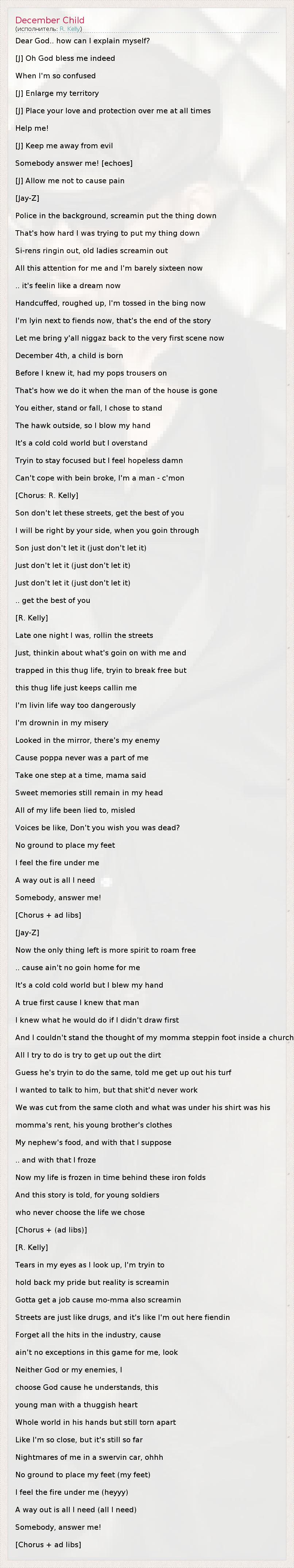 Dear God.. how can I explain myself? [J] Oh God bless me indeed When I'm so confused [J] Enlarge my territory [J] Place your love and protection over me at all times Help me! [J] Keep me away from evil Somebody answer me! [echoes] [J] Allow me not to cause pain [Jay-Z] Police in the background, screamin put the thing down That's how hard I was trying to put my thing down Si-rens ringin out, old ladies screamin out All this attention for me and I'm barely sixteen now .. it's feelin like a dream now Handcuffed, roughed up, I'm tossed in the bing now I'm lyin next to fiends now, that's the end of the story Let me bring y'all niggaz back to the very first scene now December 4th, a child is born Before I knew it, had my pops trousers on That's how we do it when the man of the house is gone You either, stand or fall, I chose to stand The hawk outside, so I blow my hand It's a cold cold world but I overstand Tryin to stay focused but I feel hopeless damn Can't cope with bein broke, I'm a man - c'mon [Chorus: R. Kelly] Son don't let these streets, get the best of you I will be right by your side, when you goin through Son just don't let it (just don't let it) Just don't let it (just don't let it) Just don't let it (just don't let it) .. get the best of you [R. Kelly] Late one night I was, rollin the streets Just, thinkin about what's goin on with me and trapped in this thug life, tryin to break free but this thug life just keeps callin me I'm livin life way too dangerously I'm drownin in my misery Looked in the mirror, there's my enemy Cause poppa never was a part of me Take one step at a time, mama said Sweet memories still remain in my head All of my life been lied to, misled Voices be like, Don't you wish you was dead? No ground to place my feet I feel the fire under me A way out is all I need Somebody, answer me! [Chorus + ad libs] [Jay-Z] Now the only thing left is more spirit to roam free .. cause ain't no goin home for me It's a cold cold world but I blew my hand A true first cause I knew that man I knew what he would do if I didn't draw first And I couldn't stand the thought of my momma steppin foot inside a church All I try to do is try to get up out the dirt Guess he's tryin to do the same, told me get up out his turf I wanted to talk to him, but that shit'd never work We was cut from the same cloth and what was under his shirt was his momma's rent, his young brother's clothes My nephew's food, and with that I suppose .. and with that I froze Now my life is frozen in time behind these iron folds And this story is told, for young soldiers who never choose the life we chose [Chorus + (ad libs)] [R. Kelly] Tears in my eyes as I look up, I'm tryin to hold back my pride but reality is screamin Gotta get a job cause mo-mma also screamin Streets are just like drugs, and it's like I'm out here fiendin Forget all the hits in the industry, cause ain't no exceptions in this game for me, look Neither God or my enemies, I choose God cause he understands, this young man with a thuggish heart Whole world in his hands but still torn apart Like I'm so close, but it's still so far Nightmares of me in a swervin car, ohhh No ground to place my feet (my feet) I feel the fire under me (heyyy) A way out is all I need (all I need) Somebody, answer me! [Chorus + ad libs]