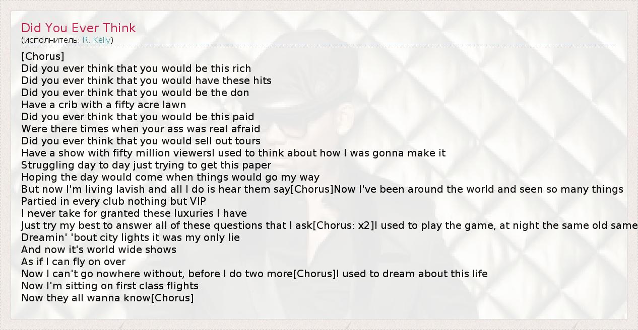 [Chorus] Did you ever think that you would be this rich Did you ever think that you would have these hits Did you ever think that you would be the don Have a crib with a fifty acre lawn Did you ever think that you would be this paid Were there times when your ass was real afraid Did you ever think that you would sell out tours Have a show with fifty million viewersI used to think about how I was gonna make it Struggling day to day just trying to get this paper Hoping the day would come when things would go my way But now I'm living lavish and all I do is hear them say[Chorus]Now I've been around the world and seen so many things Partied in every club nothing but VIP I never take for granted these luxuries I have Just try my best to answer all of these questions that I ask[Chorus: x2]I used to play the game, at night the same old same Dreamin' 'bout city lights it was my only lie And now it's world wide shows As if I can fly on over Now I can't go nowhere without, before I do two more[Chorus]I used to dream about this life Now I'm sitting on first class flights Now they all wanna know[Chorus]