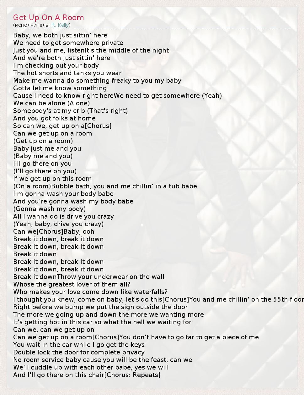 Baby, we both just sittin' here We need to get somewhere private Just you and me, listenIt's the middle of the night And we're both just sittin' here I'm checking out your body The hot shorts and tanks you wear Make me wanna do something freaky to you my baby Gotta let me know something Cause I need to know right hereWe need to get somewhere (Yeah) We can be alone (Alone) Somebody's at my crib (That's right) And you got folks at home So can we, get up on a[Chorus] Can we get up on a room (Get up on a room) Baby just me and you (Baby me and you) I'll go there on you (I'll go there on you) If we get up on this room (On a room)Bubble bath, you and me chillin' in a tub babe I'm gonna wash your body babe And you're gonna wash my body babe (Gonna wash my body) All I wanna do is drive you crazy (Yeah, baby, drive you crazy) Can we[Chorus]Baby, ooh Break it down, break it down Break it down, break it down Break it down Break it down, break it down Break it down, break it down Break it downThrow your underwear on the wall Whose the greatest lover of them all? Who makes your love come down like waterfalls? I thought you knew, come on baby, let's do this[Chorus]You and me chillin' on the 55th floor Right before we bump we put the sign outside the door The more we going up and down the more we wanting more It's getting hot in this car so what the hell we waiting for Can we, can we get up on Can we get up on a room[Chorus]You don't have to go far to get a piece of me You wait in the car while I go get the keys Double lock the door for complete privacy No room service baby cause you will be the feast, can we We'll cuddle up with each other babe, yes we will And I'll go there on this chair[Chorus: Repeats]