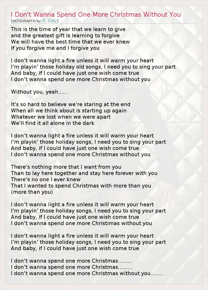 Это то время года, когда мы учимся дарить подарки, А они учат нас прощать Мы проведем лучшее время, Если ты простишь меня, а я прощу тебя Я не хочу зажигать огонь, пока твое сердце не растает Я играю эту старую праздничную песню, мне нужно, чтобы ты спела свою часть Малышка, если бы только одно мое желание могло сбыться Я не хочу проводить еще одно Рождество без тебя Без тебя, да...... Так трудно поверить в то, что конец наших отношений близок, Когда все, о чем мы думаем, это то, как начать сначала Что бы мы ни потеряли, когда расстались, Мы поймем это, когда останемся одни Я не хочу зажигать огонь, пока твое сердце не потеплеет, Я играю эту старую праздничную песню, мне нужно, чтобы ты спела свою часть Малышка, если бы только одно мое желание могло сбыться Я не хочу проводить еще одно Рождество без тебя Мне больше ничего от тебя не нужно, Только навсегда остаться с тобой Нет никого, с кем бы Я хотел провести Рождество больше, чем с тобой (больше, чем с тобой) Я не хочу зажигать огонь, пока твое сердце не потеплеет Я играю эту старую праздничную песню, мне нужно, чтобы ты спела свою часть Малышка, если бы только одно мое желание могло сбыться Я не хочу проводить еще одно Рождество без тебя Я не хочу зажигать огонь, пока твое сердце не потеплеет Я играю эту старую праздничную песню, мне нужно, чтобы ты спела свою часть Малышка, если бы только одно мое желание могло сбыться Я не хочу проводить еще одно Рождество без тебя Я не хочу проводить еще одно Рождество......... Я не хочу проводить еще одно Рождество......... Я не хочу проводить еще одно Рождество без тебя........