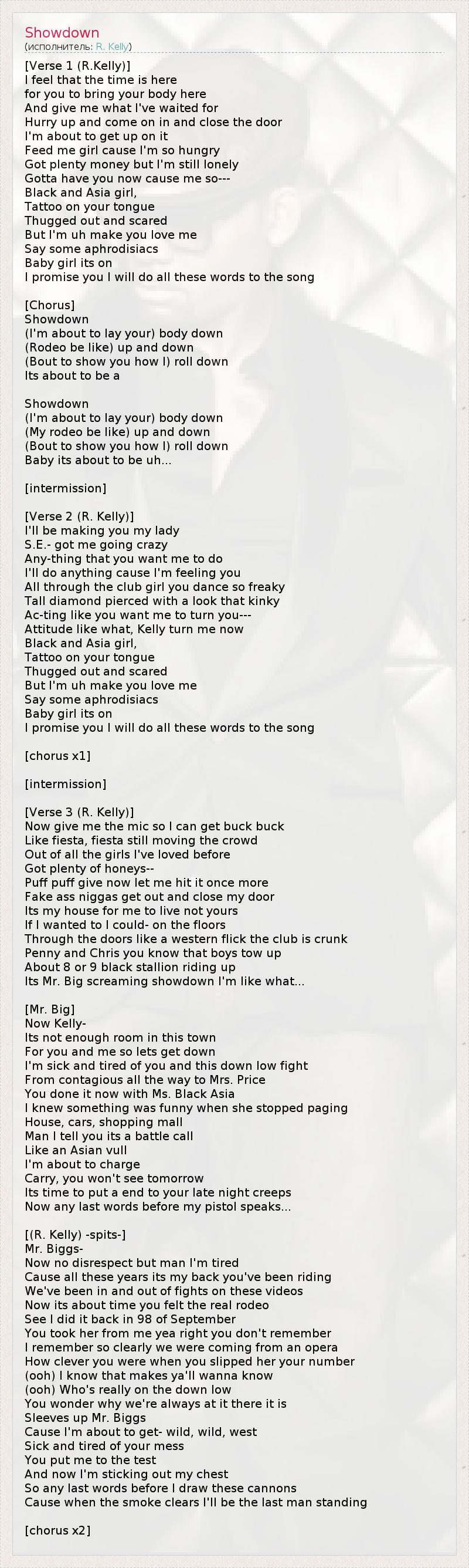 [Verse 1 (R.Kelly)] I feel that the time is here for you to bring your body here And give me what I've waited for Hurry up and come on in and close the door I'm about to get up on it Feed me girl cause I'm so hungry Got plenty money but I'm still lonely Gotta have you now cause me so--- Black and Asia girl, Tattoo on your tongue Thugged out and scared But I'm uh make you love me Say some aphrodisiacs Baby girl its on I promise you I will do all these words to the song [Chorus] Showdown (I'm about to lay your) body down (Rodeo be like) up and down (Bout to show you how I) roll down Its about to be a Showdown (I'm about to lay your) body down (My rodeo be like) up and down (Bout to show you how I) roll down Baby its about to be uh... [intermission] [Verse 2 (R. Kelly)] I'll be making you my lady S.E.- got me going crazy Any-thing that you want me to do I'll do anything cause I'm feeling you All through the club girl you dance so freaky Tall diamond pierced with a look that kinky Ac-ting like you want me to turn you--- Attitude like what, Kelly turn me now Black and Asia girl, Tattoo on your tongue Thugged out and scared But I'm uh make you love me Say some aphrodisiacs Baby girl its on I promise you I will do all these words to the song [chorus x1] [intermission] [Verse 3 (R. Kelly)] Now give me the mic so I can get buck buck Like fiesta, fiesta still moving the crowd Out of all the girls I've loved before Got plenty of honeys-- Puff puff give now let me hit it once more Fake ass niggas get out and close my door Its my house for me to live not yours If I wanted to I could- on the floors Through the doors like a western flick the club is crunk Penny and Chris you know that boys tow up About 8 or 9 black stallion riding up Its Mr. Big screaming showdown I'm like what... [Mr. Big] Now Kelly- Its not enough room in this town For you and me so lets get down I'm sick and tired of you and this down low fight From contagious all the way to Mrs. Price You done it now with Ms. Black Asia I knew something was funny when she stopped paging House, cars, shopping mall Man I tell you its a battle call Like an Asian vull I'm about to charge Carry, you won't see tomorrow Its time to put a end to your late night creeps Now any last words before my pistol speaks... [(R. Kelly) -spits-] Mr. Biggs- Now no disrespect but man I'm tired Cause all these years its my back you've been riding We've been in and out of fights on these videos Now its about time you felt the real rodeo See I did it back in 98 of September You took her from me yea right you don't remember I remember so clearly we were coming from an opera How clever you were when you slipped her your number (ooh) I know that makes ya'll wanna know (ooh) Who's really on the down low You wonder why we're always at it there it is Sleeves up Mr. Biggs Cause I'm about to get- wild, wild, west Sick and tired of your mess You put me to the test And now I'm sticking out my chest So any last words before I draw these cannons Cause when the smoke clears I'll be the last man standing [chorus x2]
