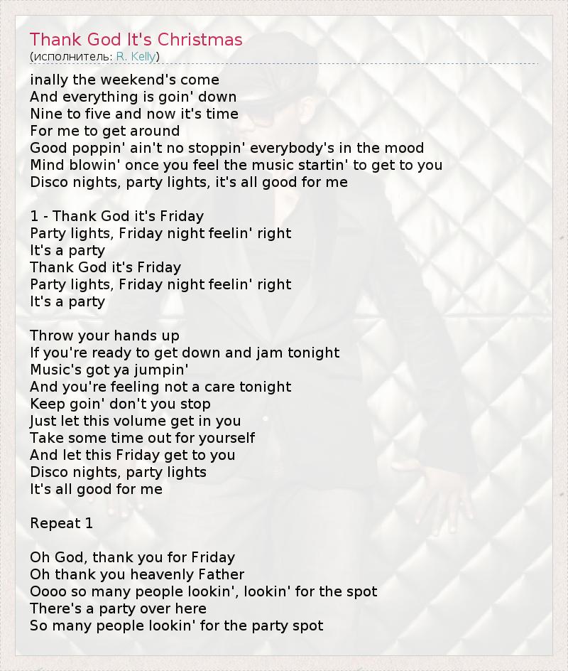 inally the weekend's come And everything is goin' down Nine to five and now it's time For me to get around Good poppin' ain't no stoppin' everybody's in the mood Mind blowin' once you feel the music startin' to get to you Disco nights, party lights, it's all good for me 1 - Thank God it's Friday Party lights, Friday night feelin' right It's a party Thank God it's Friday Party lights, Friday night feelin' right It's a party Throw your hands up If you're ready to get down and jam tonight Music's got ya jumpin' And you're feeling not a care tonight Keep goin' don't you stop Just let this volume get in you Take some time out for yourself And let this Friday get to you Disco nights, party lights It's all good for me Repeat 1 Oh God, thank you for Friday Oh thank you heavenly Father Oooo so many people lookin', lookin' for the spot There's a party over here So many people lookin' for the party spot