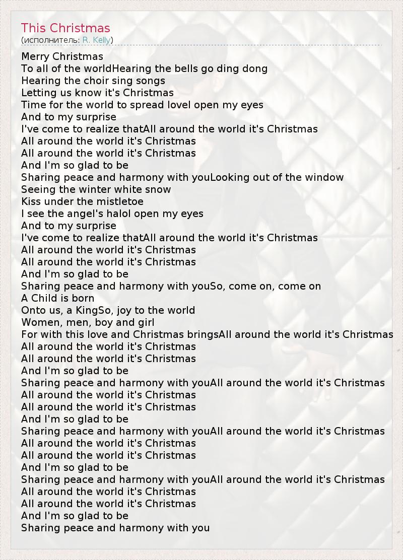 Merry Christmas To all of the worldHearing the bells go ding dong Hearing the choir sing songs Letting us know it's Christmas Time for the world to spread loveI open my eyes And to my surprise I've come to realize thatAll around the world it's Christmas All around the world it's Christmas All around the world it's Christmas And I'm so glad to be Sharing peace and harmony with youLooking out of the window Seeing the winter white snow Kiss under the mistletoe I see the angel's haloI open my eyes And to my surprise I've come to realize thatAll around the world it's Christmas All around the world it's Christmas All around the world it's Christmas And I'm so glad to be Sharing peace and harmony with youSo, come on, come on A Child is born Onto us, a KingSo, joy to the world Women, men, boy and girl For with this love and Christmas bringsAll around the world it's Christmas All around the world it's Christmas All around the world it's Christmas And I'm so glad to be Sharing peace and harmony with youAll around the world it's Christmas All around the world it's Christmas All around the world it's Christmas And I'm so glad to be Sharing peace and harmony with youAll around the world it's Christmas All around the world it's Christmas All around the world it's Christmas And I'm so glad to be Sharing peace and harmony with youAll around the world it's Christmas All around the world it's Christmas All around the world it's Christmas And I'm so glad to be Sharing peace and harmony with you