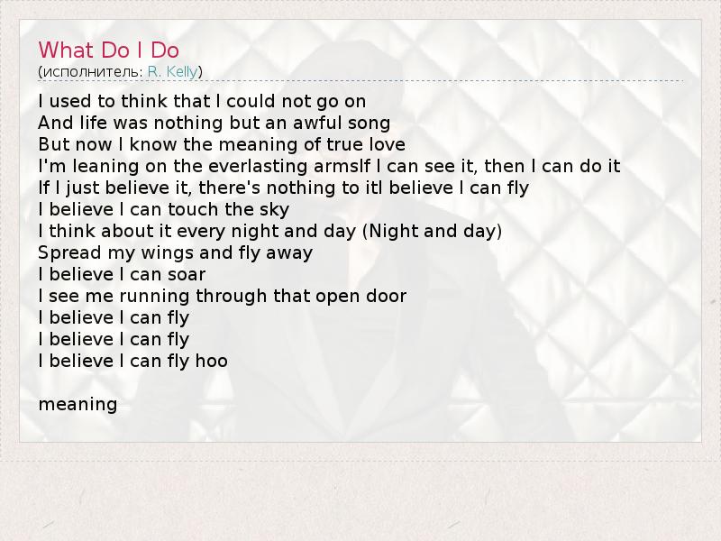 I used to think that I could not go on And life was nothing but an awful song But now I know the meaning of true love I'm leaning on the everlasting armsIf I can see it, then I can do it If I just believe it, there's nothing to itI believe I can fly I believe I can touch the sky I think about it every night and day (Night and day) Spread my wings and fly away I believe I can soar I see me running through that open door I believe I can fly I believe I can fly I believe I can fly hoo meaning