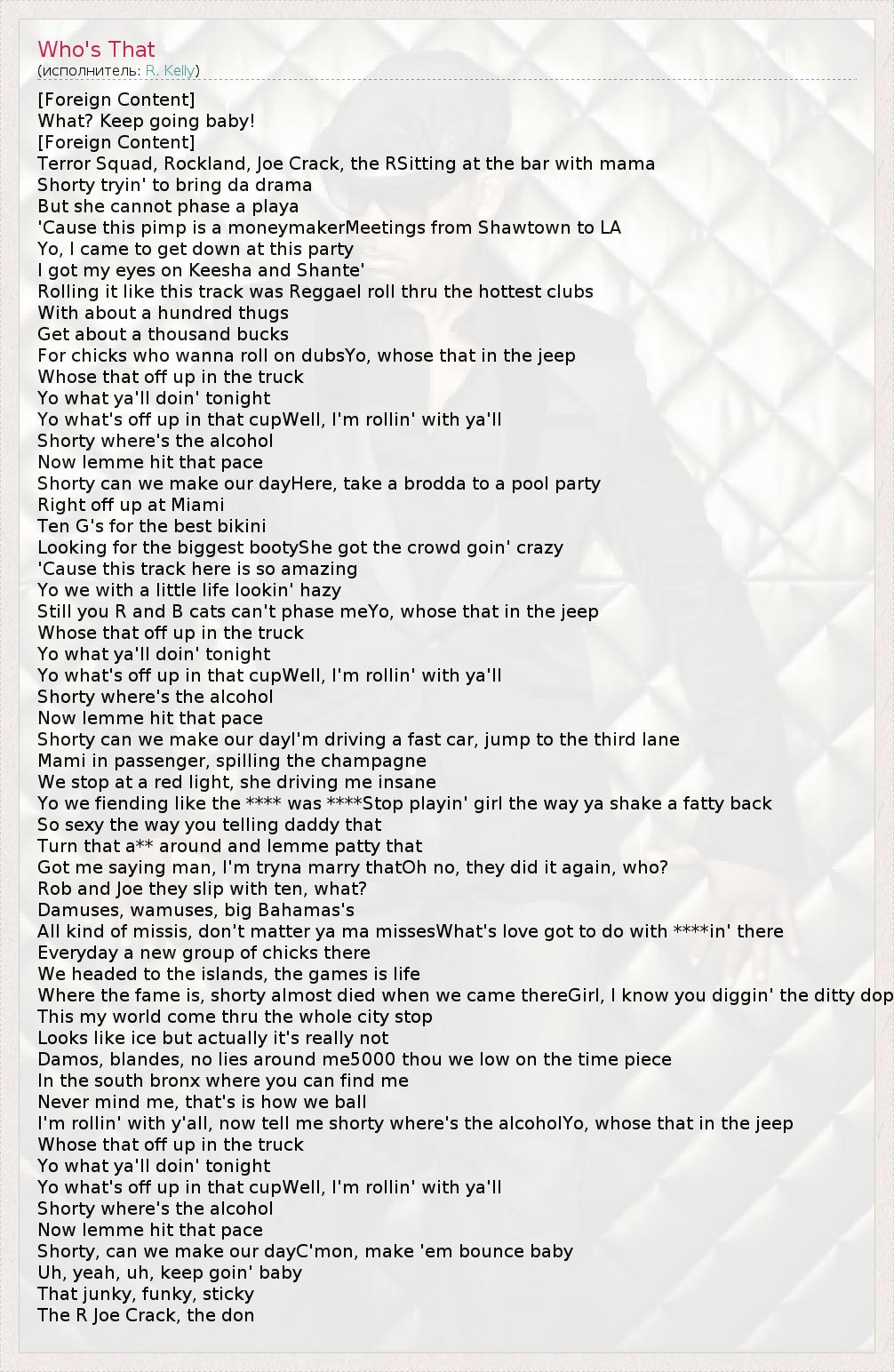 [Foreign Content] What? Keep going baby! [Foreign Content] Terror Squad, Rockland, Joe Crack, the RSitting at the bar with mama Shorty tryin' to bring da drama But she cannot phase a playa 'Cause this pimp is a moneymakerMeetings from Shawtown to LA Yo, I came to get down at this party I got my eyes on Keesha and Shante' Rolling it like this track was ReggaeI roll thru the hottest clubs With about a hundred thugs Get about a thousand bucks For chicks who wanna roll on dubsYo, whose that in the jeep Whose that off up in the truck Yo what ya'll doin' tonight Yo what's off up in that cupWell, I'm rollin' with ya'll Shorty where's the alcohol Now lemme hit that pace Shorty can we make our dayHere, take a brodda to a pool party Right off up at Miami Ten G's for the best bikini Looking for the biggest bootyShe got the crowd goin' crazy 'Cause this track here is so amazing Yo we with a little life lookin' hazy Still you R and B cats can't phase meYo, whose that in the jeep Whose that off up in the truck Yo what ya'll doin' tonight Yo what's off up in that cupWell, I'm rollin' with ya'll Shorty where's the alcohol Now lemme hit that pace Shorty can we make our dayI'm driving a fast car, jump to the third lane Mami in passenger, spilling the champagne We stop at a red light, she driving me insane Yo we fiending like the **** was ****Stop playin' girl the way ya shake a fatty back So sexy the way you telling daddy that Turn that a** around and lemme patty that Got me saying man, I'm tryna marry thatOh no, they did it again, who? Rob and Joe they slip with ten, what? Damuses, wamuses, big Bahamas's All kind of missis, don't matter ya ma missesWhat's love got to do with ****in' there Everyday a new group of chicks there We headed to the islands, the games is life Where the fame is, shorty almost died when we came thereGirl, I know you diggin' the ditty dop This my world come thru the whole city stop Looks like ice but actually it's really not Damos, blandes, no lies around me5000 thou we low on the time piece In the south bronx where you can find me Never mind me, that's is how we ball I'm rollin' with y'all, now tell me shorty where's the alcoholYo, whose that in the jeep Whose that off up in the truck Yo what ya'll doin' tonight Yo what's off up in that cupWell, I'm rollin' with ya'll Shorty where's the alcohol Now lemme hit that pace Shorty, can we make our dayC'mon, make 'em bounce baby Uh, yeah, uh, keep goin' baby That junky, funky, sticky The R Joe Crack, the don