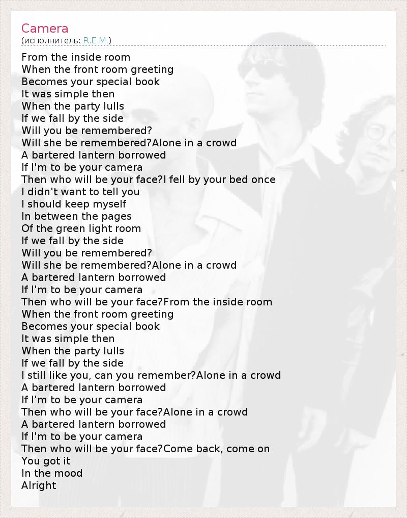 Это интересно:Свой первый концерт «R.E.M.» отыграли в американском городишке Атенс, штат Джорджия, 19 апреля 1980 года. В состав группы входили четверо выгнанных из университета парней: Майкл Стайп (р. 4 января 1960, Декатер, США; вокал), Питер Бак (р. 6 декабря 1956, Беркли, США; гитара), Майк Миллс (р. 17 декабря 1958, Оранж Каунти, США; бас) и Билл Берри (р. 31 июля 1958, Далат, США; ударные). Приобретя неплохую популярность... продолжение