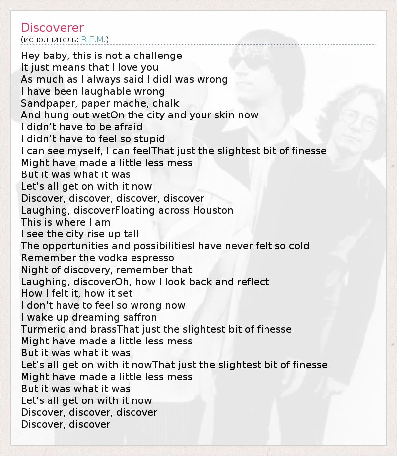 Это интересно:Свой первый концерт «R.E.M.» отыграли в американском городишке Атенс, штат Джорджия, 19 апреля 1980 года. В состав группы входили четверо выгнанных из университета парней: Майкл Стайп (р. 4 января 1960, Декатер, США; вокал), Питер Бак (р. 6 декабря 1956, Беркли, США; гитара), Майк Миллс (р. 17 декабря 1958, Оранж Каунти, США; бас) и Билл Берри (р. 31 июля 1958, Далат, США; ударные). Приобретя неплохую популярность... продолжение