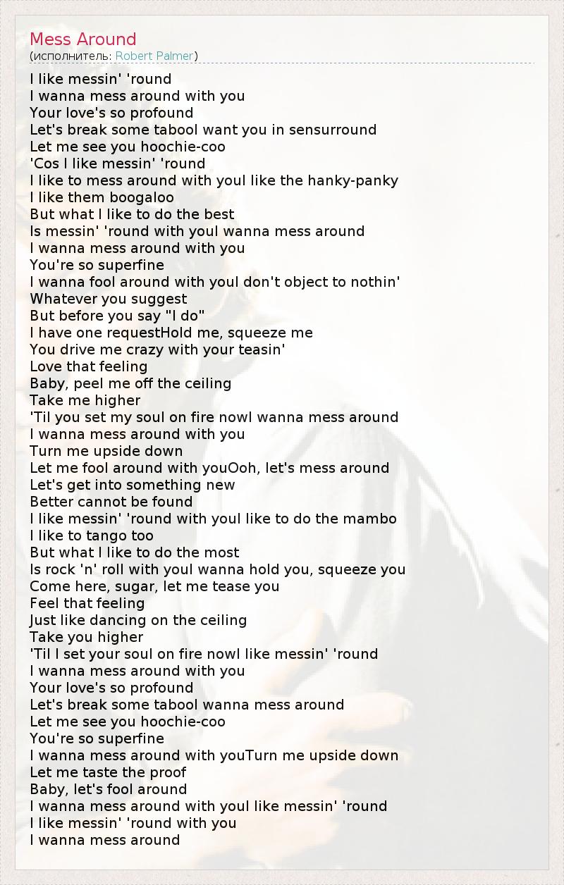 I like messin' 'round I wanna mess around with you Your love's so profound Let's break some tabooI want you in sensurround Let me see you hoochie-coo 'Cos I like messin' 'round I like to mess around with youI like the hanky-panky I like them boogaloo But what I like to do the best Is messin' 'round with youI wanna mess around I wanna mess around with you You're so superfine I wanna fool around with youI don't object to nothin' Whatever you suggest But before you say "I do" I have one requestHold me, squeeze me You drive me crazy with your teasin' Love that feeling Baby, peel me off the ceiling Take me higher 'Til you set my soul on fire nowI wanna mess around I wanna mess around with you Turn me upside down Let me fool around with youOoh, let's mess around Let's get into something new Better cannot be found I like messin' 'round with youI like to do the mambo I like to tango too But what I like to do the most Is rock 'n' roll with youI wanna hold you, squeeze you Come here, sugar, let me tease you Feel that feeling Just like dancing on the ceiling Take you higher 'Til I set your soul on fire nowI like messin' 'round I wanna mess around with you Your love's so profound Let's break some tabooI wanna mess around Let me see you hoochie-coo You're so superfine I wanna mess around with youTurn me upside down Let me taste the proof Baby, let's fool around I wanna mess around with youI like messin' 'round I like messin' 'round with you I wanna mess around