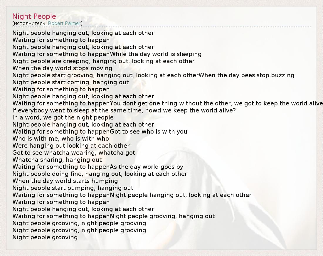 Night people start grooving, hanging out, looking at each otherWhen the day bees stop buzzing