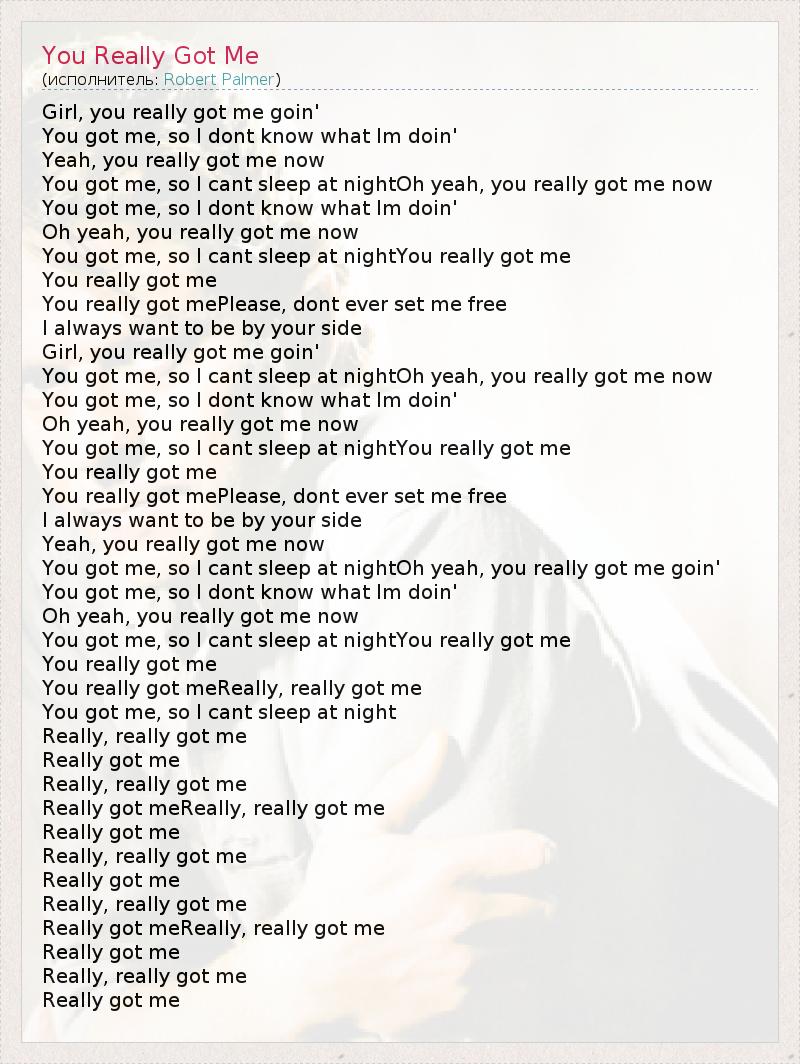 Girl, you really got me goin' You got me, so I dont know what Im doin' Yeah, you really got me now You got me, so I cant sleep at nightOh yeah, you really got me now You got me, so I dont know what Im doin' Oh yeah, you really got me now You got me, so I cant sleep at nightYou really got me You really got me You really got mePlease, dont ever set me free I always want to be by your side Girl, you really got me goin' You got me, so I cant sleep at nightOh yeah, you really got me now You got me, so I dont know what Im doin' Oh yeah, you really got me now You got me, so I cant sleep at nightYou really got me You really got me You really got mePlease, dont ever set me free I always want to be by your side Yeah, you really got me now You got me, so I cant sleep at nightOh yeah, you really got me goin' You got me, so I dont know what Im doin' Oh yeah, you really got me now You got me, so I cant sleep at nightYou really got me You really got me You really got meReally, really got me You got me, so I cant sleep at night Really, really got me Really got me Really, really got me Really got meReally, really got me Really got me Really, really got me Really got me Really, really got me Really got meReally, really got me Really got me Really, really got me Really got me