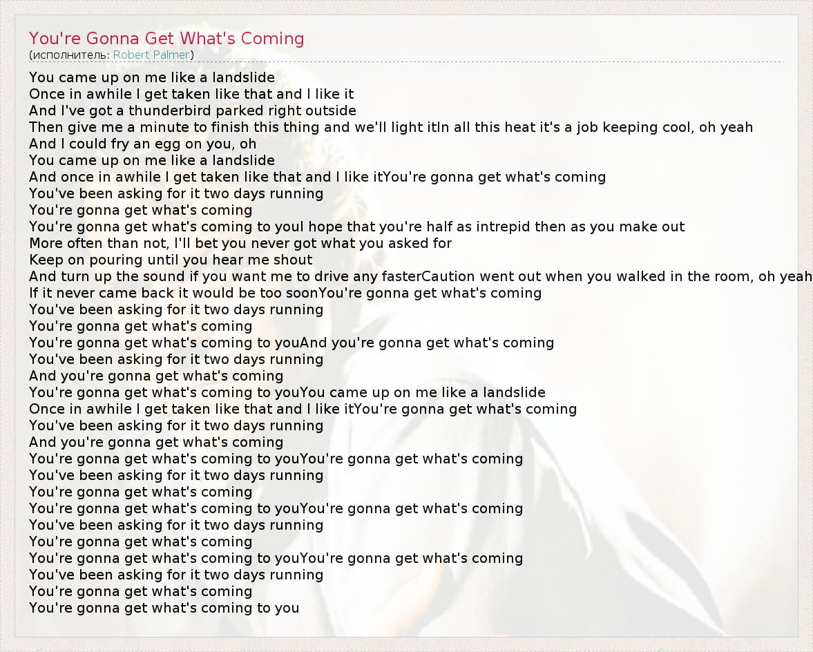 You came up on me like a landslide Once in awhile I get taken like that and I like it And I've got a thunderbird parked right outside Then give me a minute to finish this thing and we'll light itIn all this heat it's a job keeping cool, oh yeah And I could fry an egg on you, oh You came up on me like a landslide And once in awhile I get taken like that and I like itYou're gonna get what's coming You've been asking for it two days running You're gonna get what's coming You're gonna get what's coming to youI hope that you're half as intrepid then as you make out More often than not, I'll bet you never got what you asked for Keep on pouring until you hear me shout And turn up the sound if you want me to drive any fasterCaution went out when you walked in the room, oh yeah If it never came back it would be too soonYou're gonna get what's coming You've been asking for it two days running You're gonna get what's coming You're gonna get what's coming to youAnd you're gonna get what's coming You've been asking for it two days running And you're gonna get what's coming You're gonna get what's coming to youYou came up on me like a landslide Once in awhile I get taken like that and I like itYou're gonna get what's coming You've been asking for it two days running And you're gonna get what's coming You're gonna get what's coming to youYou're gonna get what's coming You've been asking for it two days running You're gonna get what's coming You're gonna get what's coming to youYou're gonna get what's coming You've been asking for it two days running You're gonna get what's coming You're gonna get what's coming to youYou're gonna get what's coming You've been asking for it two days running You're gonna get what's coming You're gonna get what's coming to you