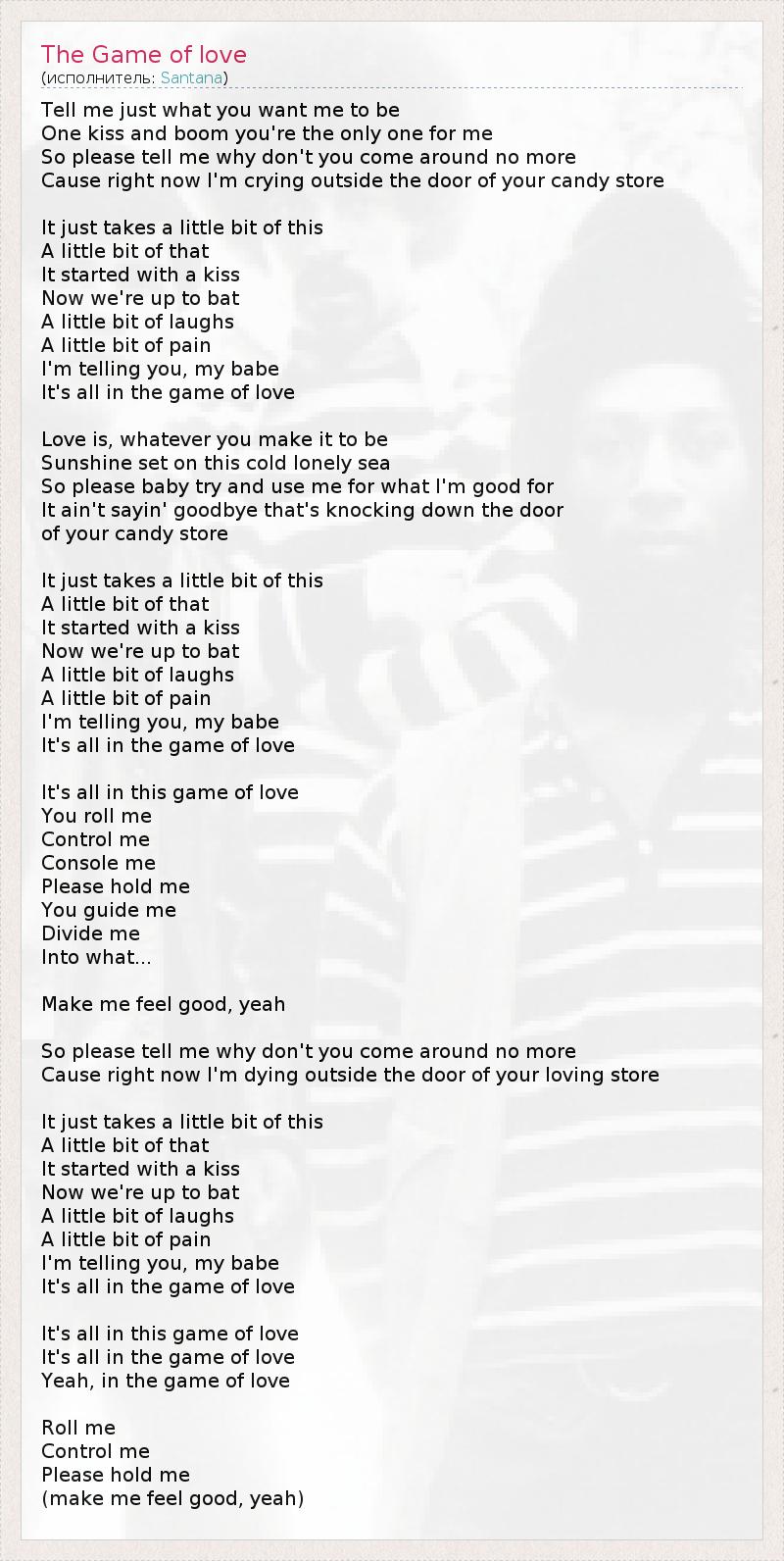 Tell me just what you want me to be One kiss and boom you're the only one for me So please tell me why don't you come around no more Cause right now I'm crying outside the door of your candy store It just takes a little bit of this A little bit of that It started with a kiss Now we're up to bat A little bit of laughs A little bit of pain I'm telling you, my babe It's all in the game of love Love is, whatever you make it to be Sunshine set on this cold lonely sea So please baby try and use me for what I'm good for It ain't sayin' goodbye that's knocking down the door of your candy store It just takes a little bit of this A little bit of that It started with a kiss Now we're up to bat A little bit of laughs A little bit of pain I'm telling you, my babe It's all in the game of love It's all in this game of love You roll me Control me Console me Please hold me You guide me Divide me Into what... Make me feel good, yeah So please tell me why don't you come around no more Cause right now I'm dying outside the door of your loving store It just takes a little bit of this A little bit of that It started with a kiss Now we're up to bat A little bit of laughs A little bit of pain I'm telling you, my babe It's all in the game of love It's all in this game of love It's all in the game of love Yeah, in the game of love Roll me Control me Please hold me (make me feel good, yeah)
