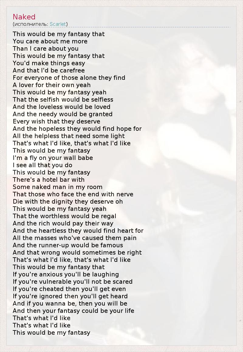 This would be my fantasy that You care about me more Than I care about you This would be my fantasy that You'd make things easy And that I'd be carefree For everyone of those alone they find A lover for their own yeah This would be my fantasy yeah That the selfish would be selfless And the loveless would be loved And the needy would be granted Every wish that they deserve And the hopeless they would find hope for All the helpless that need some light That's what I'd like, that's what I'd like This would be my fantasy I'm a fly on your wall babe I see all that you do This would be my fantasy There's a hotel bar with Some naked man in my room That those who face the end with nerve Die with the dignity they deserve oh This would be my fantasy yeah That the worthless would be regal And the rich would pay their way And the heartless they would find heart for All the masses who've caused them pain And the runner-up would be famous And that wrong would sometimes be right That's what I'd like, that's what I'd like This would be my fantasy that If you're anxious you'll be laughing If you're vulnerable you'll not be scared If you're cheated then you'll get even If you're ignored then you'll get heard And if you wanna be, then you will be And then your fantasy could be your life That's what I'd like That's what I'd like This would be my fantasy