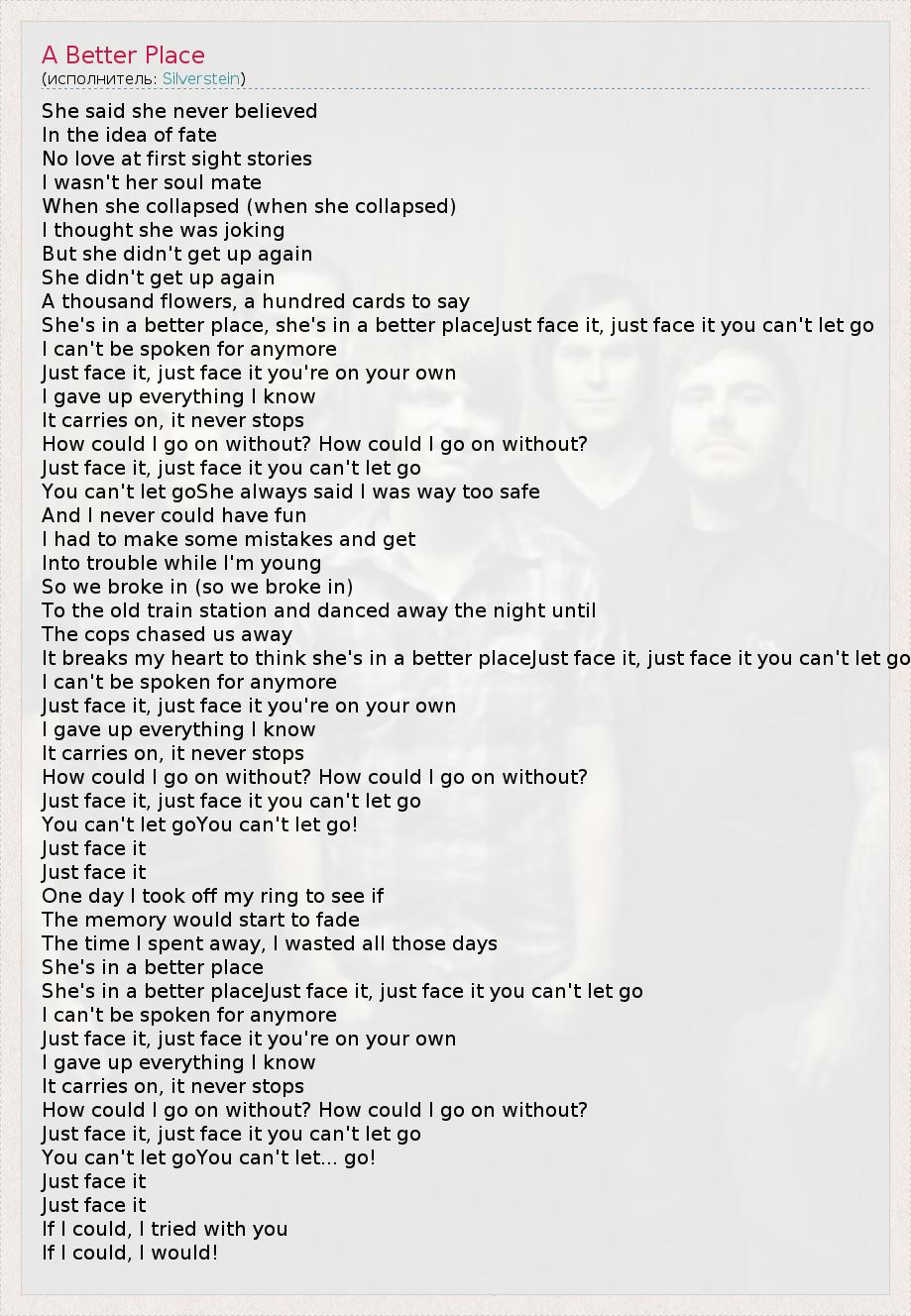 She's in a better place, she's in a better placeJust face it, just face it you can't let go