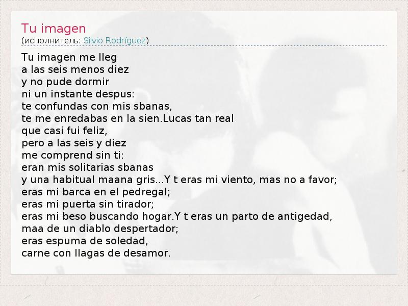 Это интересно:Си́львио Родри́гес Доми́нгес (исп. Silvio Rodríguez Domínguez; Сан-Антонио-де-Лос-Баньос, Куба, 29 ноября 1946) — кубинский музыкант, поэт и певец, oдин из основателей (наряду с Ноэлем Николой и Пабло Миланесом) кубинского песенного движения Новая Трова.За более чем 40 лет поэтического и музыкального творчества Сильвио Родригес написал огромное количество песен (от 600 до 1000, точная цифра неизвестна),... продолжение
