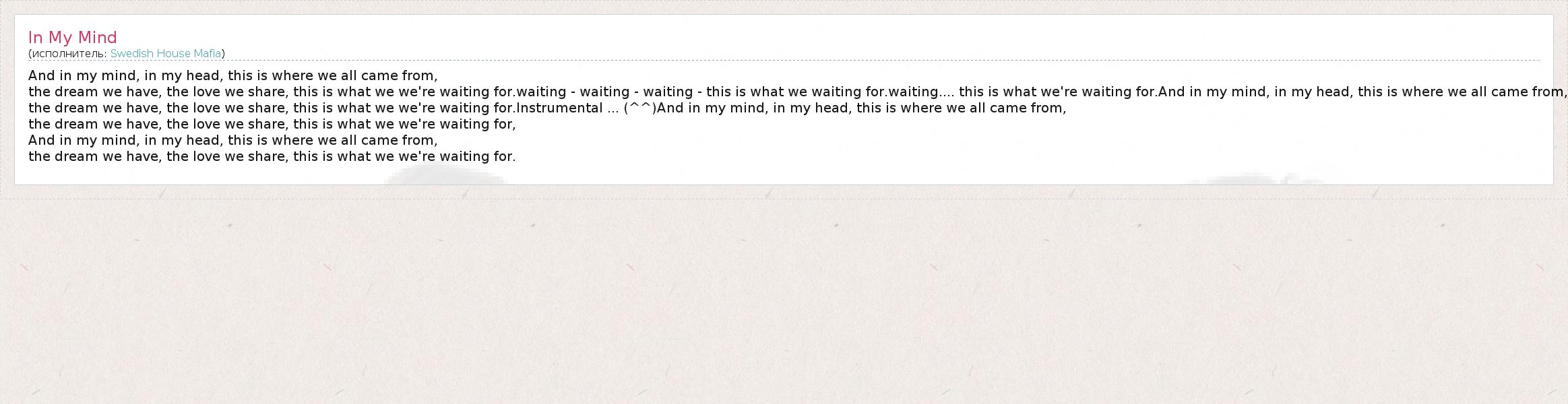 the dream we have, the love we share, this is what we we're waiting for.waiting - waiting - waiting - this is what we waiting for.waiting.... this is what we're waiting for.And in my mind, in my head, this is where we all came from,