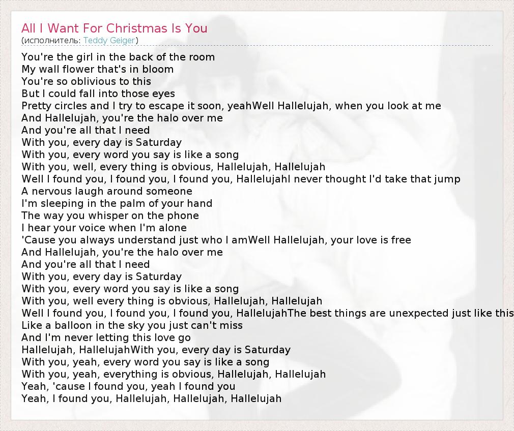 You're the girl in the back of the room My wall flower that's in bloom You're so oblivious to this But I could fall into those eyes Pretty circles and I try to escape it soon, yeahWell Hallelujah, when you look at me And Hallelujah, you're the halo over me And you're all that I need With you, every day is Saturday With you, every word you say is like a song With you, well, every thing is obvious, Hallelujah, Hallelujah Well I found you, I found you, I found you, HallelujahI never thought I'd take that jump A nervous laugh around someone I'm sleeping in the palm of your hand The way you whisper on the phone I hear your voice when I'm alone 'Cause you always understand just who I amWell Hallelujah, your love is free And Hallelujah, you're the halo over me And you're all that I need With you, every day is Saturday With you, every word you say is like a song With you, well every thing is obvious, Hallelujah, Hallelujah Well I found you, I found you, I found you, HallelujahThe best things are unexpected just like this Like a balloon in the sky you just can't miss And I'm never letting this love go Hallelujah, HallelujahWith you, every day is Saturday With you, yeah, every word you say is like a song With you, yeah, everything is obvious, Hallelujah, Hallelujah Yeah, 'cause I found you, yeah I found you Yeah, I found you, Hallelujah, Hallelujah, Hallelujah