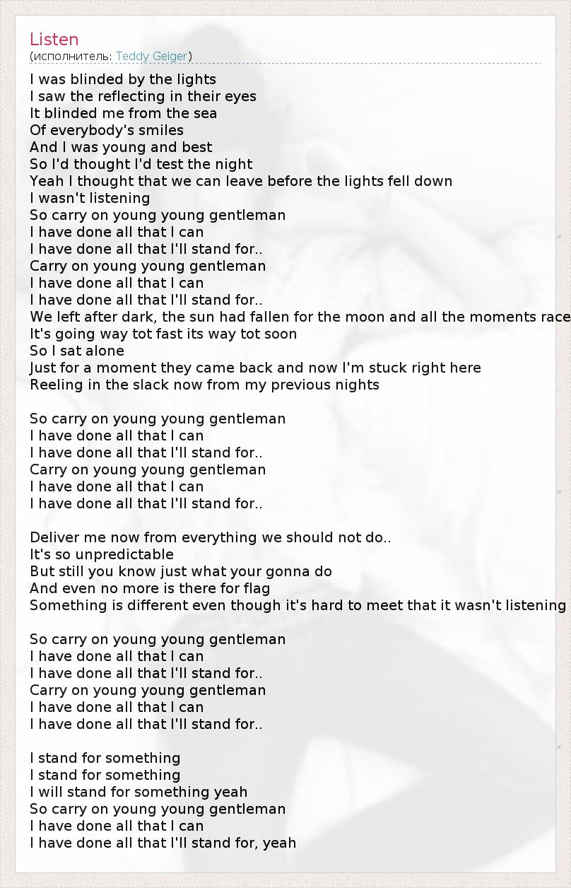 I was blinded by the lights I saw the reflecting in their eyes It blinded me from the sea Of everybody's smiles And I was young and best So I'd thought I'd test the night Yeah I thought that we can leave before the lights fell down I wasn't listening So carry on young young gentleman I have done all that I can I have done all that I'll stand for.. Carry on young young gentleman I have done all that I can I have done all that I'll stand for.. We left after dark, the sun had fallen for the moon and all the moments race It's going way tot fast its way tot soon So I sat alone Just for a moment they came back and now I'm stuck right here Reeling in the slack now from my previous nights So carry on young young gentleman I have done all that I can I have done all that I'll stand for.. Carry on young young gentleman I have done all that I can I have done all that I'll stand for.. Deliver me now from everything we should not do.. It's so unpredictable But still you know just what your gonna do And even no more is there for flag Something is different even though it's hard to meet that it wasn't listening So carry on young young gentleman I have done all that I can I have done all that I'll stand for.. Carry on young young gentleman I have done all that I can I have done all that I'll stand for.. I stand for something I stand for something I will stand for something yeah So carry on young young gentleman I have done all that I can I have done all that I'll stand for, yeah