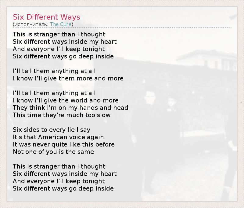 This is stranger than I thought Six different ways inside my heart And everyone I'll keep tonight Six different ways go deep inside I'll tell them anything at all I know I'll give them more and more I'll tell them anything at all I know I'll give the world and more They think I'm on my hands and head This time they're much too slow Six sides to every lie I say It's that American voice again It was never quite like this before Not one of you is the same This is stranger than I thought Six different ways inside my heart And everyone I'll keep tonight Six different ways go deep inside