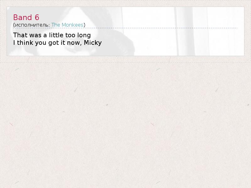 Это интересно:The Monkees — американский поп-рок-квартет, который записывался и выступал с концертами с 1966 по 1971 годы. Участники группы были впервые собраны вместе в 1965 году телеканалом NBC для съемок в телесериале о буднях современной рок-группы, образцом для которого послужил фильм The Beatles «Вечер трудного дня».Успех сериала превзошёл все ожидания, и участники The Monkees (их название означает «мартышки»... продолжение