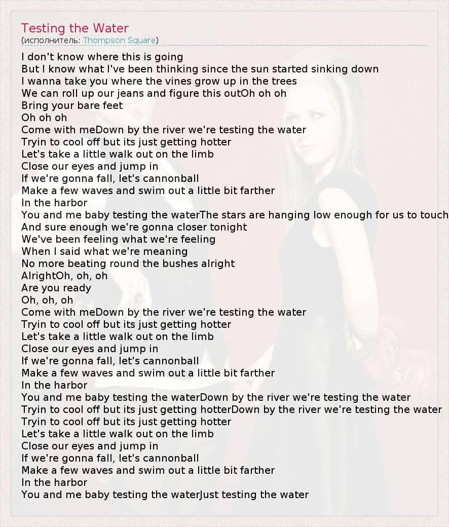 I don't know where this is going But I know what I've been thinking since the sun started sinking down I wanna take you where the vines grow up in the trees We can roll up our jeans and figure this outOh oh oh Bring your bare feet Oh oh oh Come with meDown by the river we're testing the water Tryin to cool off but its just getting hotter Let's take a little walk out on the limb Close our eyes and jump in If we're gonna fall, let's cannonball Make a few waves and swim out a little bit farther In the harbor You and me baby testing the waterThe stars are hanging low enough for us to touch And sure enough we're gonna closer tonight We've been feeling what we're feeling When I said what we're meaning No more beating round the bushes alright AlrightOh, oh, oh Are you ready Oh, oh, oh Come with meDown by the river we're testing the water Tryin to cool off but its just getting hotter Let's take a little walk out on the limb Close our eyes and jump in If we're gonna fall, let's cannonball Make a few waves and swim out a little bit farther In the harbor You and me baby testing the waterDown by the river we're testing the water Tryin to cool off but its just getting hotterDown by the river we're testing the water Tryin to cool off but its just getting hotter Let's take a little walk out on the limb Close our eyes and jump in If we're gonna fall, let's cannonball Make a few waves and swim out a little bit farther In the harbor You and me baby testing the waterJust testing the water