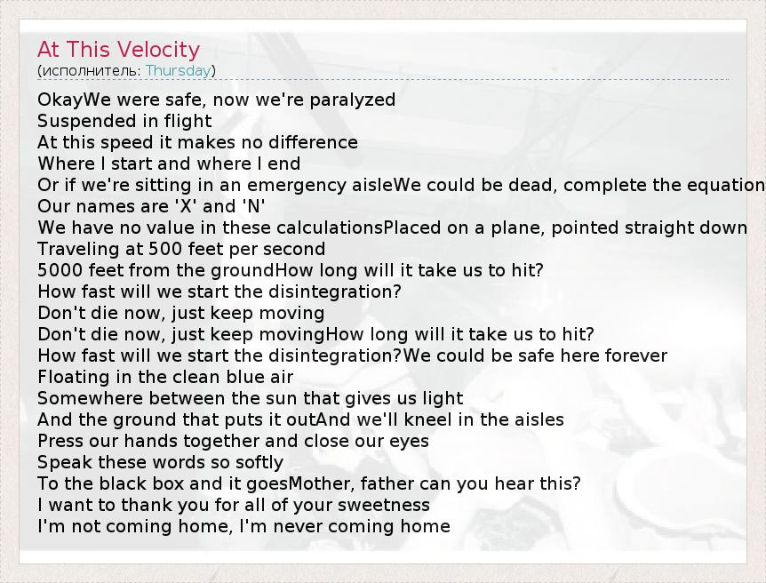 А как ты думаешь, о чем песня "At This Velocity" ?