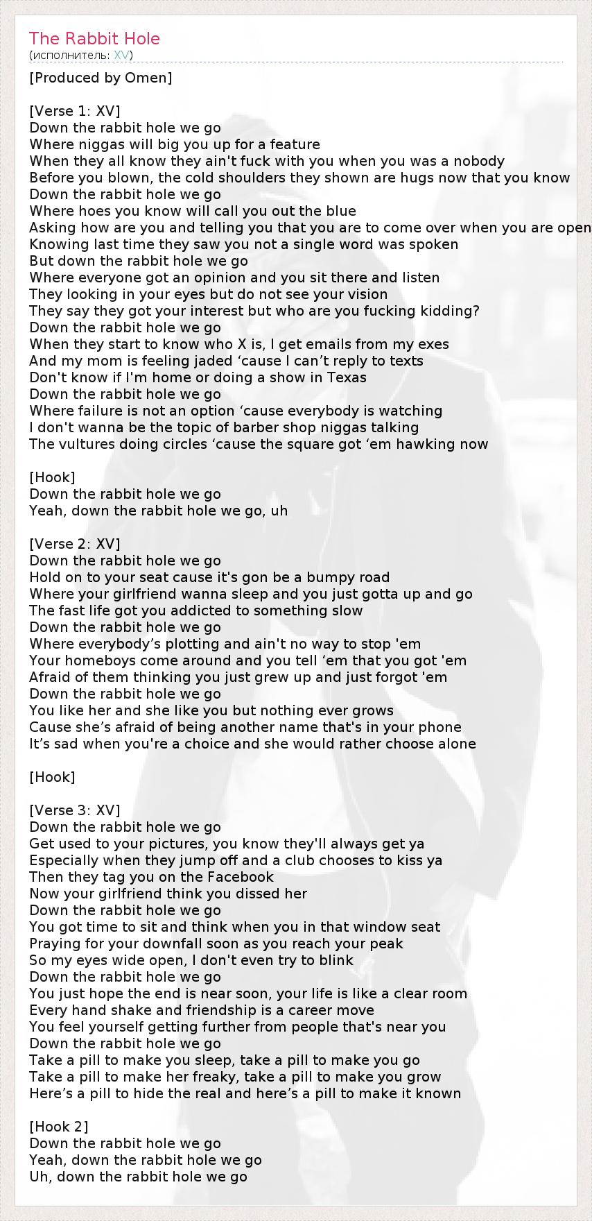 [Produced by Omen] [Verse 1: XV] Down the rabbit hole we go Where niggas will big you up for a feature When they all know they ain't fuck with you when you was a nobody Before you blown, the cold shoulders they shown are hugs now that you know Down the rabbit hole we go Where hoes you know will call you out the blue Asking how are you and telling you that you are to come over when you are open Knowing last time they saw you not a single word was spoken But down the rabbit hole we go Where everyone got an opinion and you sit there and listen They looking in your eyes but do not see your vision They say they got your interest but who are you fucking kidding? Down the rabbit hole we go When they start to know who X is, I get emails from my exes And my mom is feeling jaded ‘cause I can’t reply to texts Don't know if I'm home or doing a show in Texas Down the rabbit hole we go Where failure is not an option ‘cause everybody is watching I don't wanna be the topic of barber shop niggas talking The vultures doing circles ‘cause the square got ‘em hawking now [Hook] Down the rabbit hole we go Yeah, down the rabbit hole we go, uh [Verse 2: XV] Down the rabbit hole we go Hold on to your seat cause it's gon be a bumpy road Where your girlfriend wanna sleep and you just gotta up and go The fast life got you addicted to something slow Down the rabbit hole we go Where everybody’s plotting and ain't no way to stop 'em Your homeboys come around and you tell ‘em that you got 'em Afraid of them thinking you just grew up and just forgot 'em Down the rabbit hole we go You like her and she like you but nothing ever grows Cause she’s afraid of being another name that's in your phone It’s sad when you're a choice and she would rather choose alone [Hook] [Verse 3: XV] Down the rabbit hole we go Get used to your pictures, you know they'll always get ya Especially when they jump off and a club chooses to kiss ya Then they tag you on the Facebook Now your girlfriend think you dissed her Down the rabbit hole we go You got time to sit and think when you in that window seat Praying for your downfall soon as you reach your peak So my eyes wide open, I don't even try to blink Down the rabbit hole we go You just hope the end is near soon, your life is like a clear room Every hand shake and friendship is a career move You feel yourself getting further from people that's near you Down the rabbit hole we go Take a pill to make you sleep, take a pill to make you go Take a pill to make her freaky, take a pill to make you grow Here’s a pill to hide the real and here’s a pill to make it known [Hook 2] Down the rabbit hole we go Yeah, down the rabbit hole we go Uh, down the rabbit hole we go