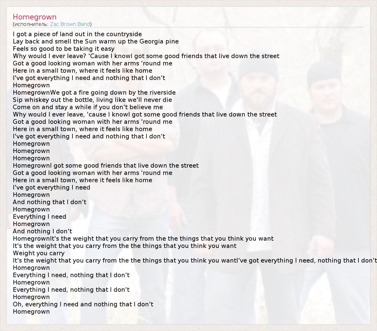 Это интересно:Zac Brown Band (сокр. ZBB, "Зак Браун Бэнд", англ. "Группа Зака Брауна") - американская кантри-группа из города Атланта, штат Джорджия. Состав группы: Зак Браун (лидирующий вокал, гитара), Джимми Де Мартини (скрипка, вокал), Джон Дрискелл Хопкинс (бас-гитара, вокал), Кой Боулз (гитара, орган), Крис Фрайар (барабаны) и Клэй Кук (гитара, орган, мандолина, педал-стил-гитар, вокал).Группа, добившаяся... продолжение