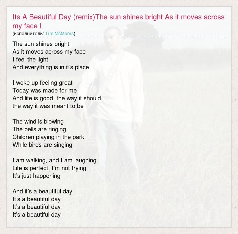 Главная→Исполнители→Tim McMorris→Its A Beautiful Day (remix)The sun shines bright As it moves across my