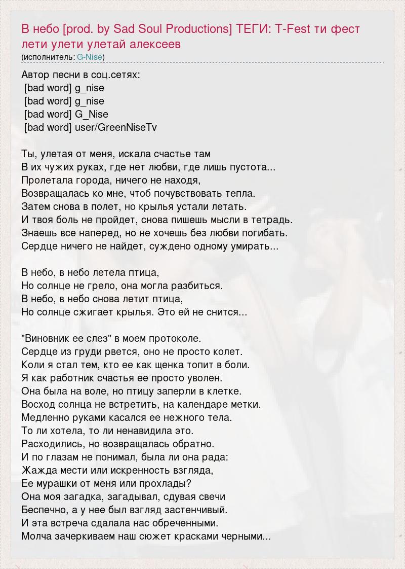 ГлавнаяИсполнителиG-NiseВ небо [prod. by Sad Soul Productions] ТЕГИ: T-Fest ти фест лети улети уле