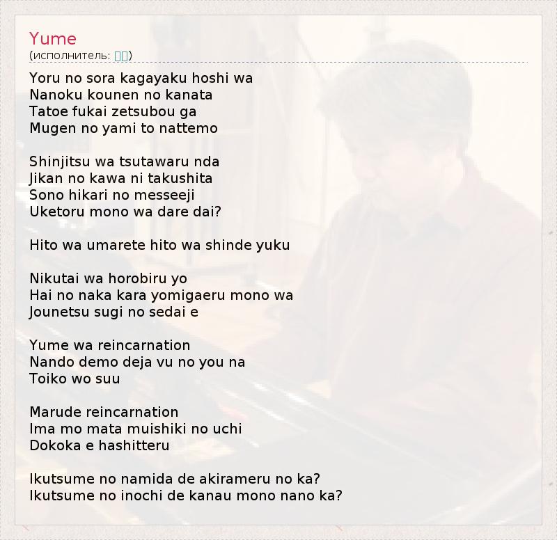 Yoru no sora kagayaku hoshi wa Nanoku kounen no kanata Tatoe fukai zetsubou ga Mugen no yami to nattemo Shinjitsu wa tsutawaru nda Jikan no kawa ni takushita Sono hikari no messeeji Uketoru mono wa dare dai? Hito wa umarete hito wa shinde yuku Nikutai wa horobiru yo Hai no naka kara yomigaeru mono wa Jounetsu sugi no sedai e Yume wa reincarnation Nando demo deja vu no you na Toiko wo suu Marude reincarnation Ima mo mata muishiki no uchi Dokoka e hashitteru Ikutsume no namida de akirameru no ka? Ikutsume no inochi de kanau mono nano ka?