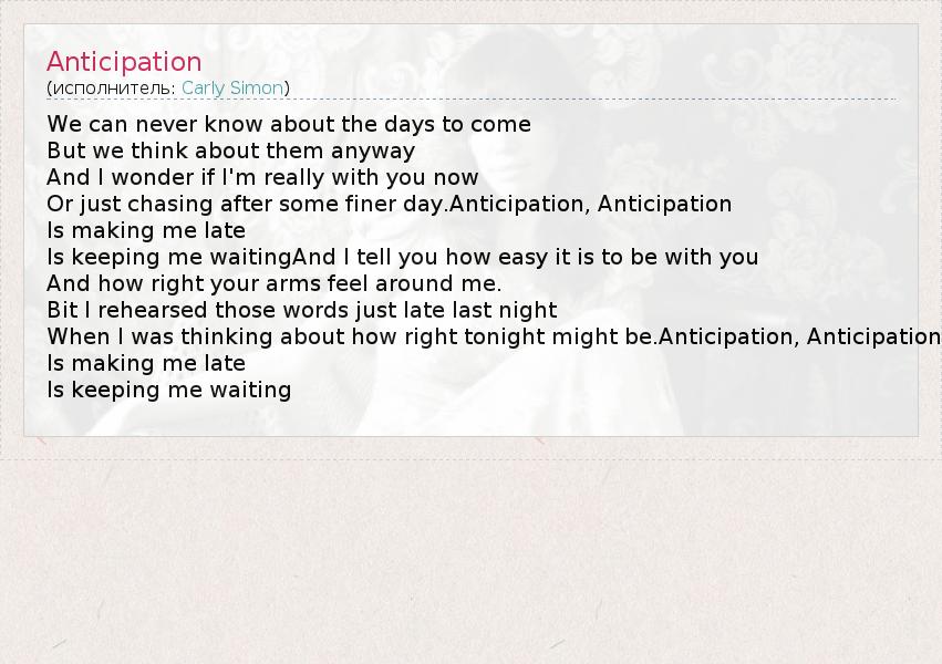 When I was thinking about how right tonight might be.Anticipation, Anticipation