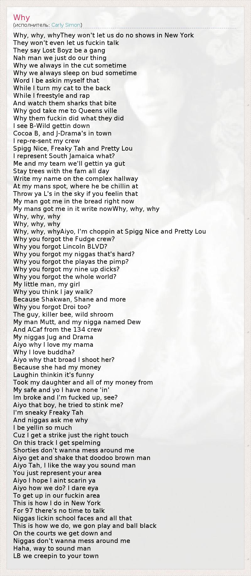 Why, why, whyThey won't let us do no shows in New York They won't even let us fuckin talk They say Lost Boyz be a gang Nah man we just do our thing Why we always in the cut sometime Why we always sleep on bud sometime Word I be askin myself that While I turn my cat to the back While I freestyle and rap And watch them sharks that bite Why god take me to Queens ville Why them fuckin did what they did I see B-Wild gettin down Cocoa B, and J-Drama's in town I rep-re-sent my crew Spigg Nice, Freaky Tah and Pretty Lou I represent South Jamaica what? Me and my team we'll gettin ya gut Stay trees with the fam all day Write my name on the complex hallway At my mans spot, where he be chillin at Throw ya L's in the sky if you feelin that My man got me in the bread right now My mans got me in it write nowWhy, why, why Why, why, why Why, why, why Why, why, whyAiyo, I'm choppin at Spigg Nice and Pretty Lou Why you forgot the Fudge crew? Why you forgot Lincoln BLVD? Why you forgot my niggas that's hard? Why you forgot the playas the pimp? Why you forgot my nine up dicks? Why you forgot the whole world? My little man, my girl Why you think I jay walk? Because Shakwan, Shane and more Why you forgot Droi too? The guy, killer bee, wild shroom My man Mutt, and my nigga named Dew And ACaf from the 134 crew My niggas Jug and Drama Aiyo why I love my mama Why I love buddha? Aiyo why that broad I shoot her? Because she had my money Laughin thinkin it's funny Took my daughter and all of my money from My safe and yo I have none 'in' Im broke and I'm fucked up, see? Aiyo that boy, he tried to stink me? I'm sneaky Freaky Tah And niggas ask me why I be yellin so much Cuz I get a strike just the right touch On this track I get spelming Shorties don't wanna mess around me Aiyo get and shake that doodoo brown man Aiyo Tah, I like the way you sound man You just represent your area Aiyo I hope I aint scarin ya Aiyo how we do? I dare eya To get up in our fuckin area This is how I do in New York For 97 there's no time to talk Niggas lickin school faces and all that This is how we do, we gon play and ball black On the courts we get down and Niggas don't wanna mess around me Haha, way to sound man LB we creepin to your town