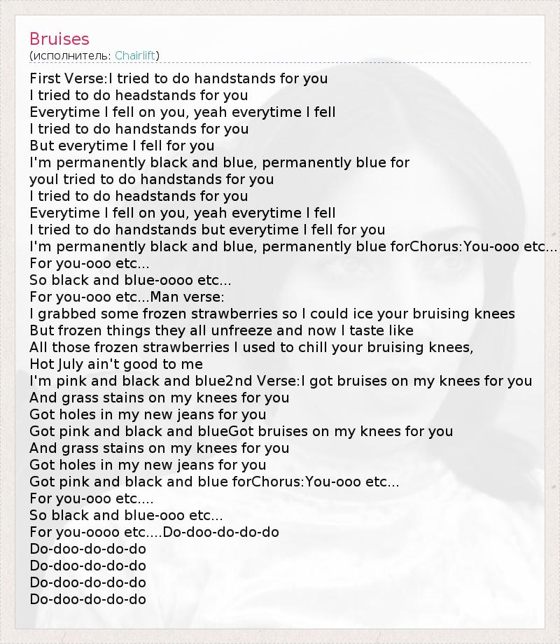 First Verse:I tried to do handstands for you I tried to do headstands for you Everytime I fell on you, yeah everytime I fell I tried to do handstands for you But everytime I fell for you I'm permanently black and blue, permanently blue for youI tried to do handstands for you I tried to do headstands for you Everytime I fell on you, yeah everytime I fell I tried to do handstands but everytime I fell for you I'm permanently black and blue, permanently blue forChorus:You-ooo etc... For you-ooo etc... So black and blue-oooo etc... For you-ooo etc...Man verse: I grabbed some frozen strawberries so I could ice your bruising knees But frozen things they all unfreeze and now I taste like All those frozen strawberries I used to chill your bruising knees, Hot July ain't good to me I'm pink and black and blue2nd Verse:I got bruises on my knees for you And grass stains on my knees for you Got holes in my new jeans for you Got pink and black and blueGot bruises on my knees for you And grass stains on my knees for you Got holes in my new jeans for you Got pink and black and blue forChorus:You-ooo etc... For you-ooo etc.... So black and blue-ooo etc... For you-oooo etc....Do-doo-do-do-do Do-doo-do-do-do Do-doo-do-do-do Do-doo-do-do-do Do-doo-do-do-do