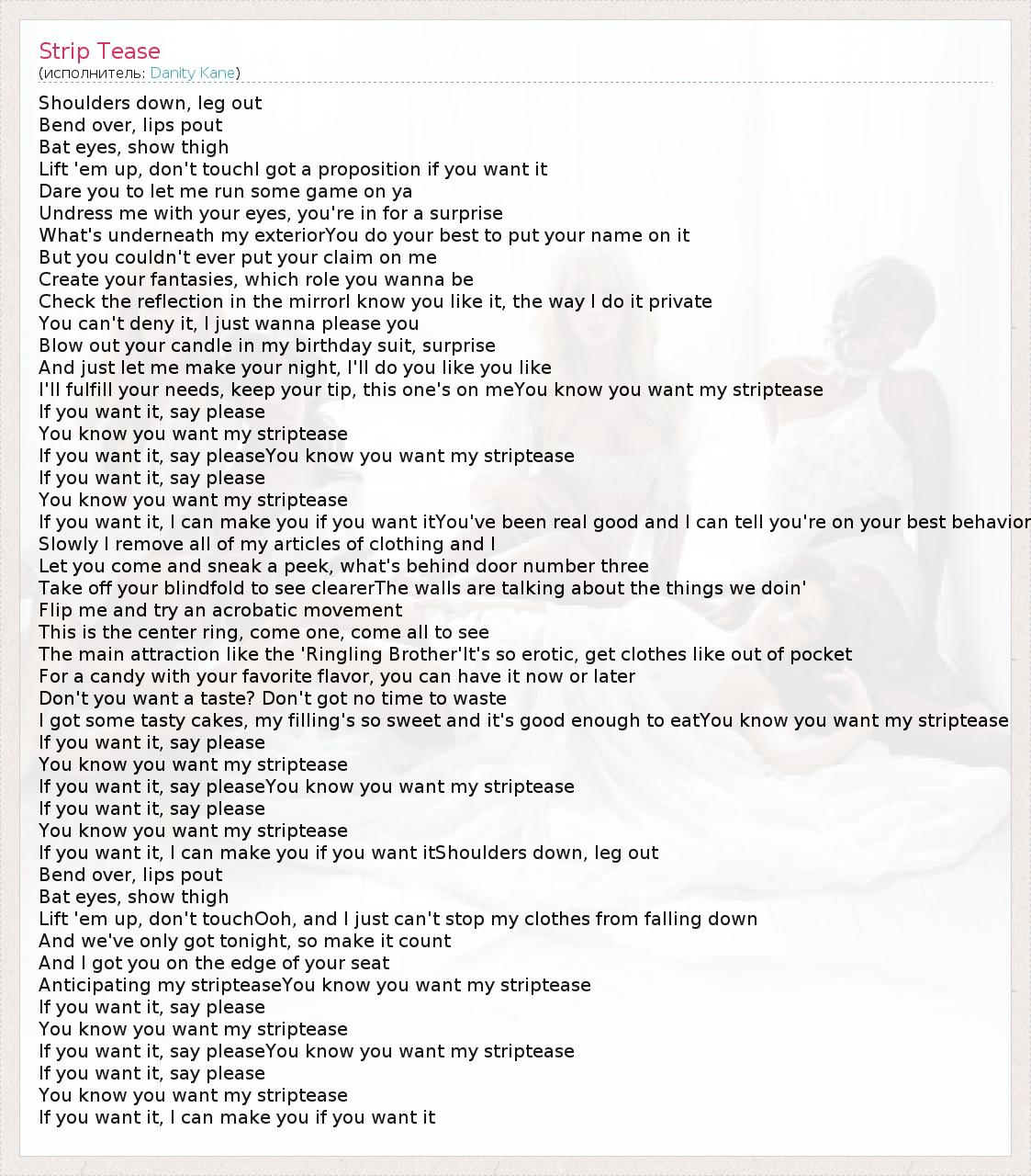 Shoulders down, leg out Bend over, lips pout Bat eyes, show thigh Lift 'em up, don't touchI got a proposition if you want it Dare you to let me run some game on ya Undress me with your eyes, you're in for a surprise What's underneath my exteriorYou do your best to put your name on it But you couldn't ever put your claim on me Create your fantasies, which role you wanna be Check the reflection in the mirrorI know you like it, the way I do it private You can't deny it, I just wanna please you Blow out your candle in my birthday suit, surprise And just let me make your night, I'll do you like you like I'll fulfill your needs, keep your tip, this one's on meYou know you want my striptease If you want it, say please You know you want my striptease If you want it, say pleaseYou know you want my striptease If you want it, say please You know you want my striptease If you want it, I can make you if you want itYou've been real good and I can tell you're on your best behavior Slowly I remove all of my articles of clothing and I Let you come and sneak a peek, what's behind door number three Take off your blindfold to see clearerThe walls are talking about the things we doin' Flip me and try an acrobatic movement This is the center ring, come one, come all to see The main attraction like the 'Ringling Brother'It's so erotic, get clothes like out of pocket For a candy with your favorite flavor, you can have it now or later Don't you want a taste? Don't got no time to waste I got some tasty cakes, my filling's so sweet and it's good enough to eatYou know you want my striptease If you want it, say please You know you want my striptease If you want it, say pleaseYou know you want my striptease If you want it, say please You know you want my striptease If you want it, I can make you if you want itShoulders down, leg out Bend over, lips pout Bat eyes, show thigh Lift 'em up, don't touchOoh, and I just can't stop my clothes from falling down And we've only got tonight, so make it count And I got you on the edge of your seat Anticipating my stripteaseYou know you want my striptease If you want it, say please You know you want my striptease If you want it, say pleaseYou know you want my striptease If you want it, say please You know you want my striptease If you want it, I can make you if you want it