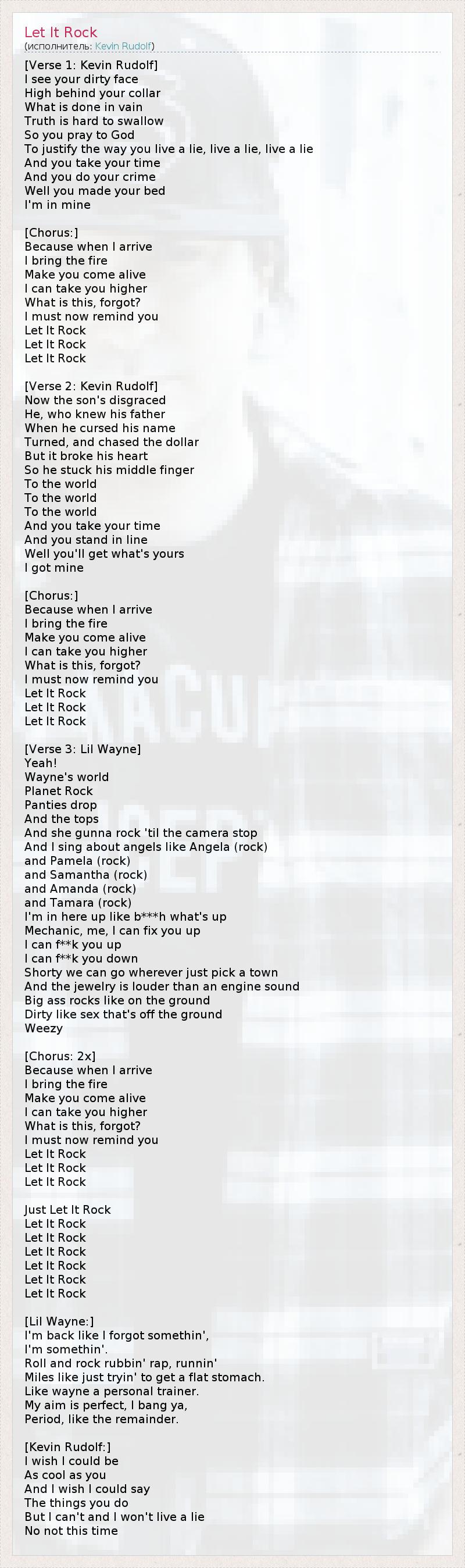 Это интересно:Kevin Rudolf - американский музыкант, который позиционирует свою музыку как смесь рока и рэпа. Подписан на Cash Money.Кевин Рудольф родился в 1983 году в Нью-Йорке (США), но после развода родителей он рос с мамой в Майами, штат Флорида. И именно его мать призвала мальчика учиться музыке; так в двенадцать лет Кевин узнает о гитаре. Он быстро понял, что это за инструмент, и научился неплохо играть. Также... продолжение