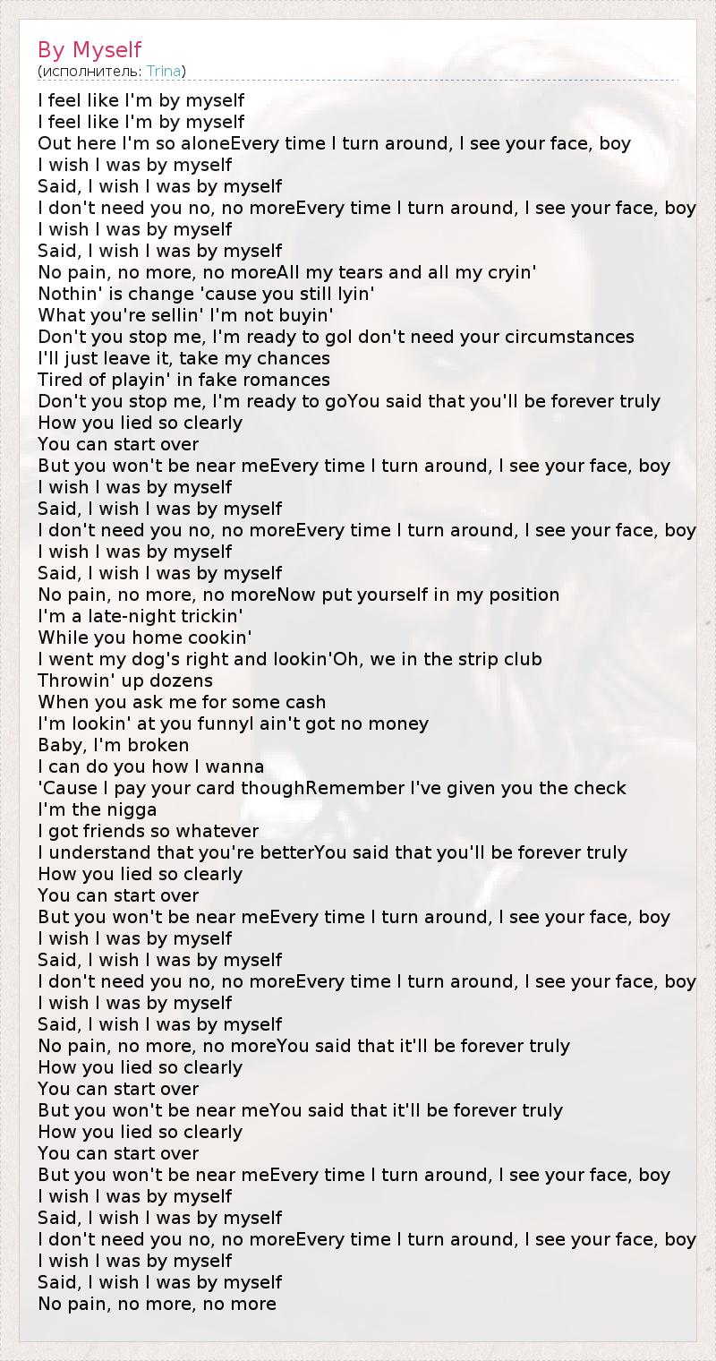I feel like I'm by myself I feel like I'm by myself Out here I'm so aloneEvery time I turn around, I see your face, boy I wish I was by myself Said, I wish I was by myself I don't need you no, no moreEvery time I turn around, I see your face, boy I wish I was by myself Said, I wish I was by myself No pain, no more, no moreAll my tears and all my cryin' Nothin' is change 'cause you still lyin' What you're sellin' I'm not buyin' Don't you stop me, I'm ready to goI don't need your circumstances I'll just leave it, take my chances Tired of playin' in fake romances Don't you stop me, I'm ready to goYou said that you'll be forever truly How you lied so clearly You can start over But you won't be near meEvery time I turn around, I see your face, boy I wish I was by myself Said, I wish I was by myself I don't need you no, no moreEvery time I turn around, I see your face, boy I wish I was by myself Said, I wish I was by myself No pain, no more, no moreNow put yourself in my position I'm a late-night trickin' While you home cookin' I went my dog's right and lookin'Oh, we in the strip club Throwin' up dozens When you ask me for some cash I'm lookin' at you funnyI ain't got no money Baby, I'm broken I can do you how I wanna 'Cause I pay your card thoughRemember I've given you the check I'm the nigga I got friends so whatever I understand that you're betterYou said that you'll be forever truly How you lied so clearly You can start over But you won't be near meEvery time I turn around, I see your face, boy I wish I was by myself Said, I wish I was by myself I don't need you no, no moreEvery time I turn around, I see your face, boy I wish I was by myself Said, I wish I was by myself No pain, no more, no moreYou said that it'll be forever truly How you lied so clearly You can start over But you won't be near meYou said that it'll be forever truly How you lied so clearly You can start over But you won't be near meEvery time I turn around, I see your face, boy I wish I was by myself Said, I wish I was by myself I don't need you no, no moreEvery time I turn around, I see your face, boy I wish I was by myself Said, I wish I was by myself No pain, no more, no more
